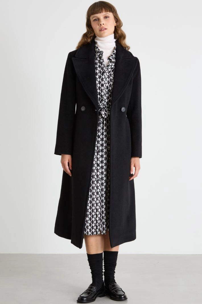 A-line shirt dress in all-over printed twill, featuring a classic collar, long sleeves with buttoned cuffs, and an elastic waistband at the back. Full-length button fastening. Matching sash.