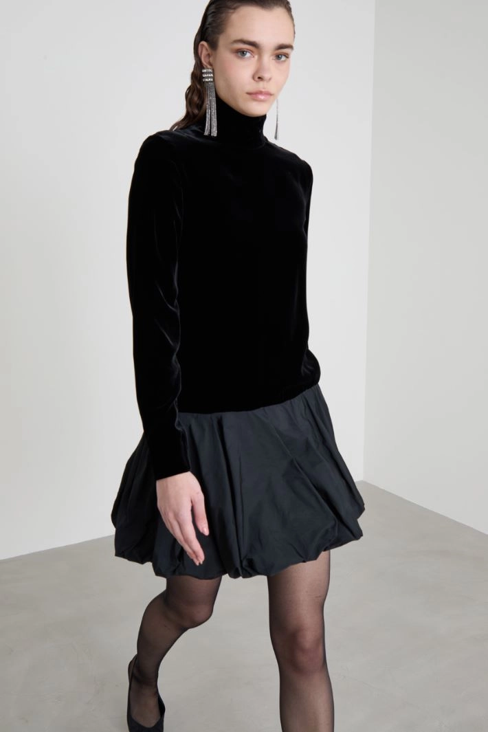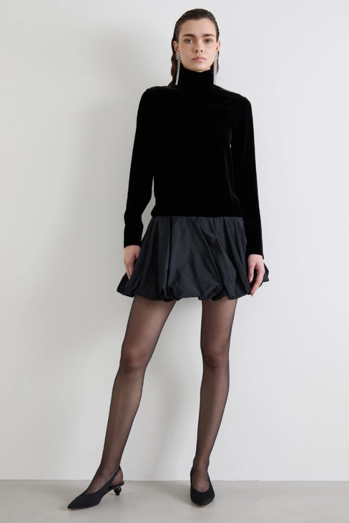 Loose-fit dress in viscose-blend velvet with flounce at the bottom, high neck and long sleeves. Invisible zip fastening at the center back. Lined.