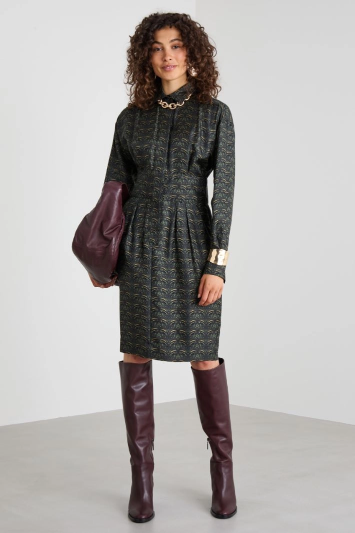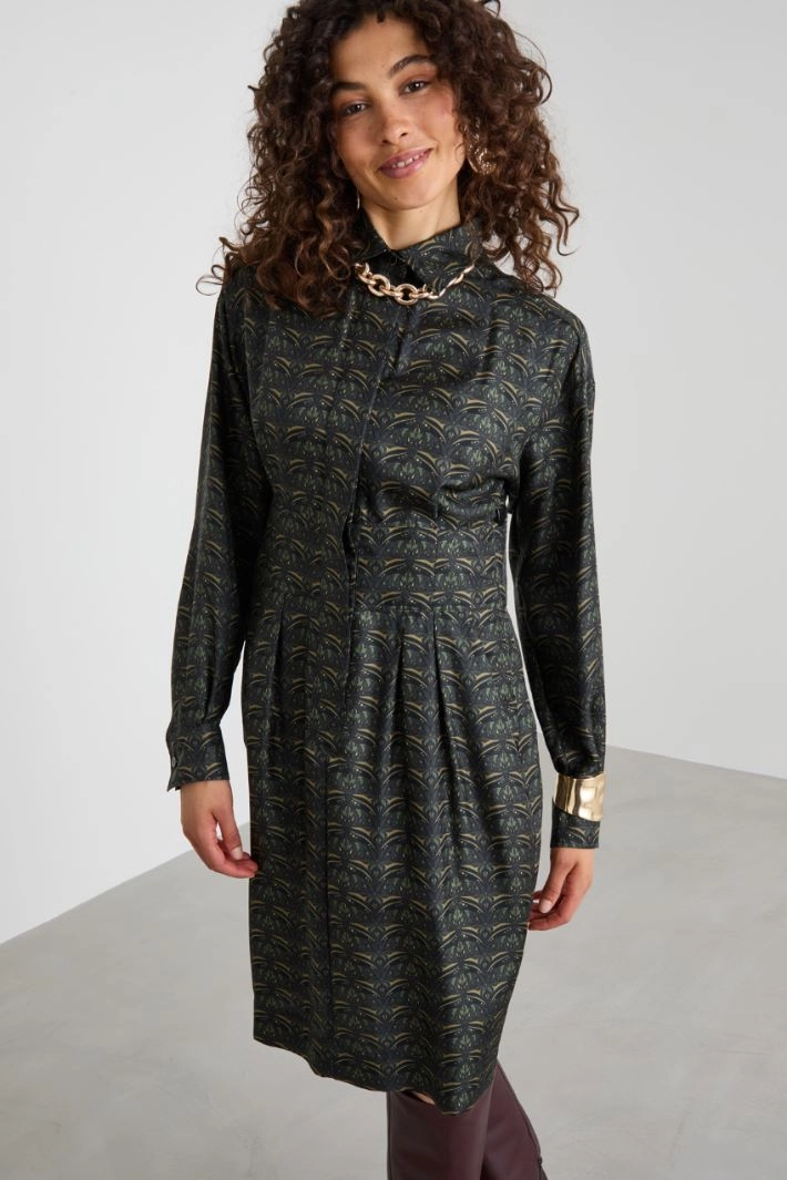 Fitted dress in printed pure silk twill, with pleats, shirt collar, long sleeves and French pockets. Concealed button fastening.