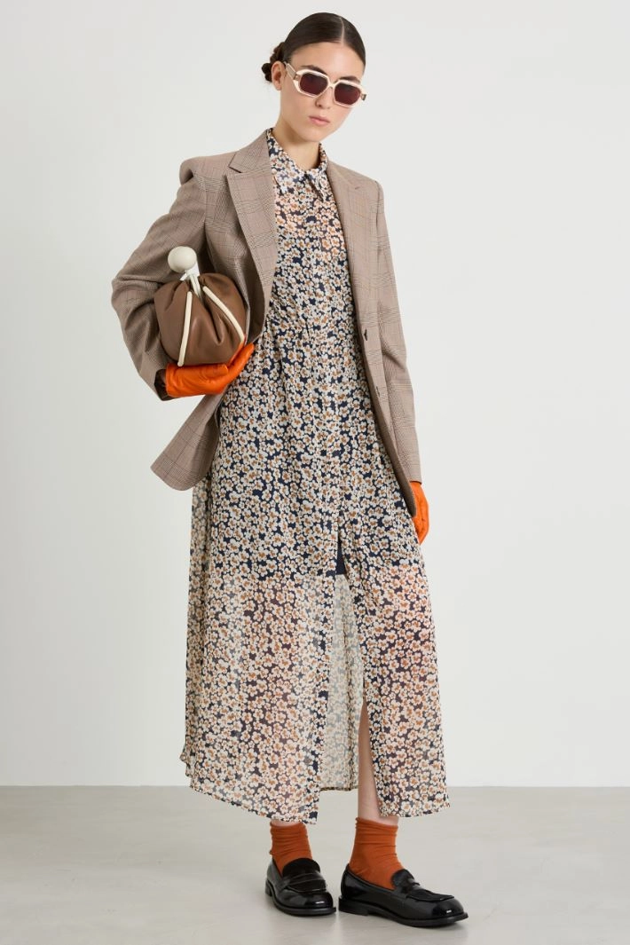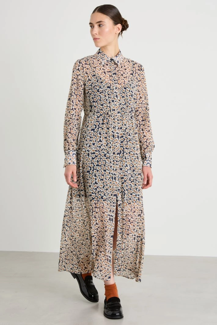 Loose-fitting shirt dress in crepon fabric, with a shirt collar, long sleeves with cuffs and buttons, and a gathered waist. Concealed button fastening. Matching slip.