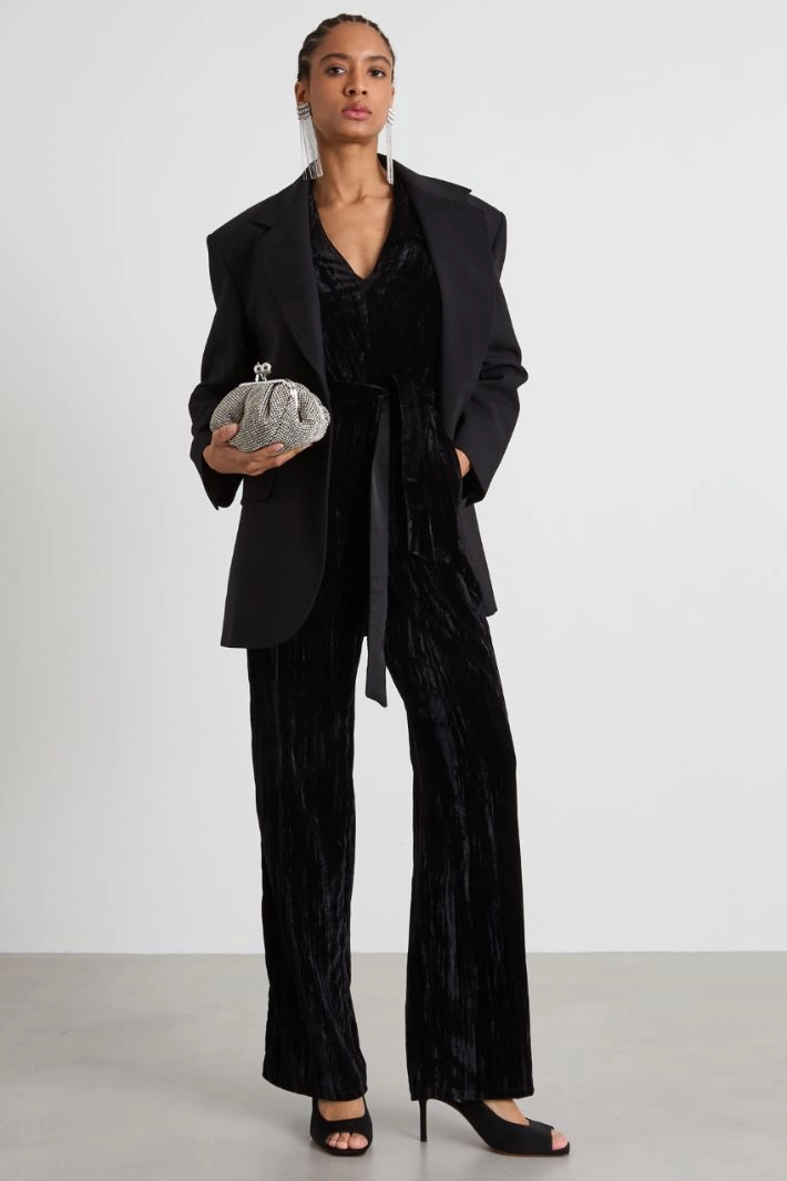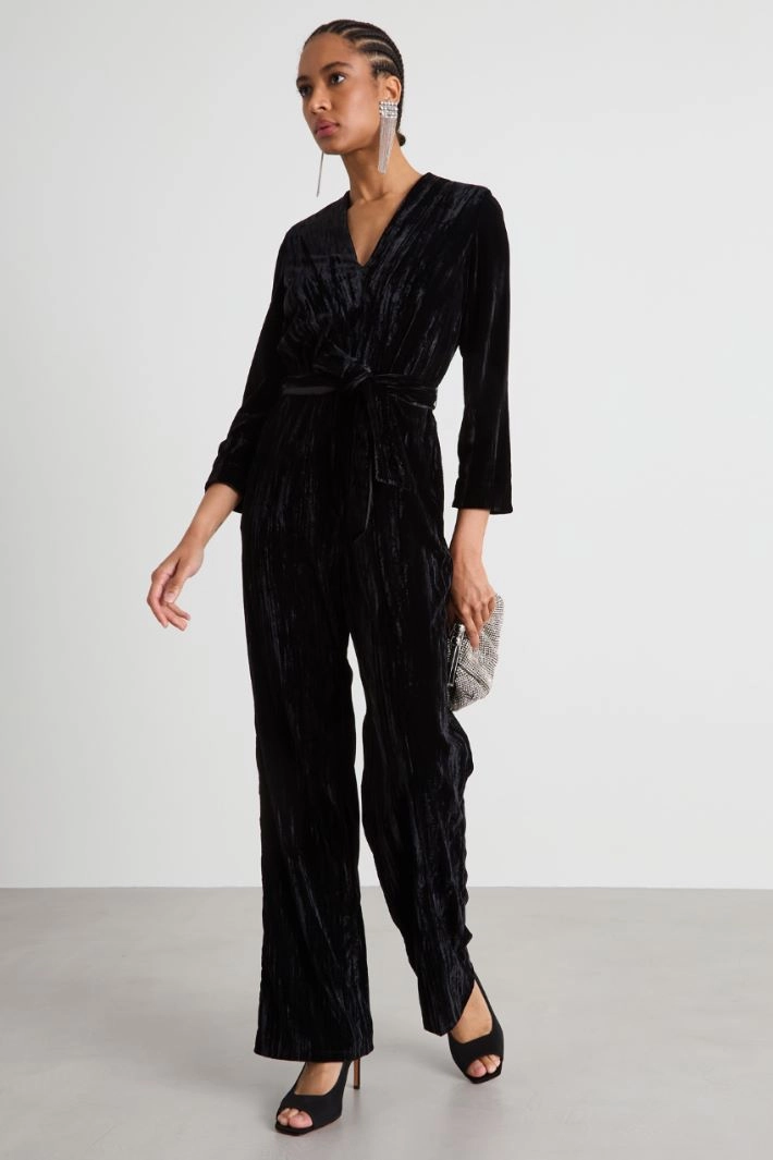 Loose-fitting jumpsuit in flat irregular corduroy, with V-neck, long sleeves, inset side pockets and matching belt. Invisible zip fastening on the center back.