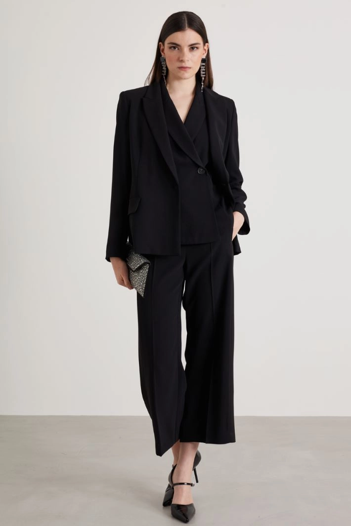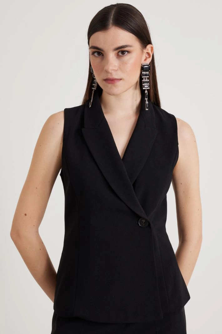 Crepe gilet with a fitted line with a lapel collar and double-breasted fastening with buttons. Semi-lined garment.