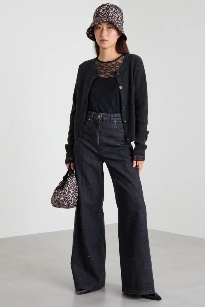 Straight-cut cardigan in viscose blend yarn, with ribbed knit, round neckline, long sleeves, patch pockets and fastening with visible metal buttons.