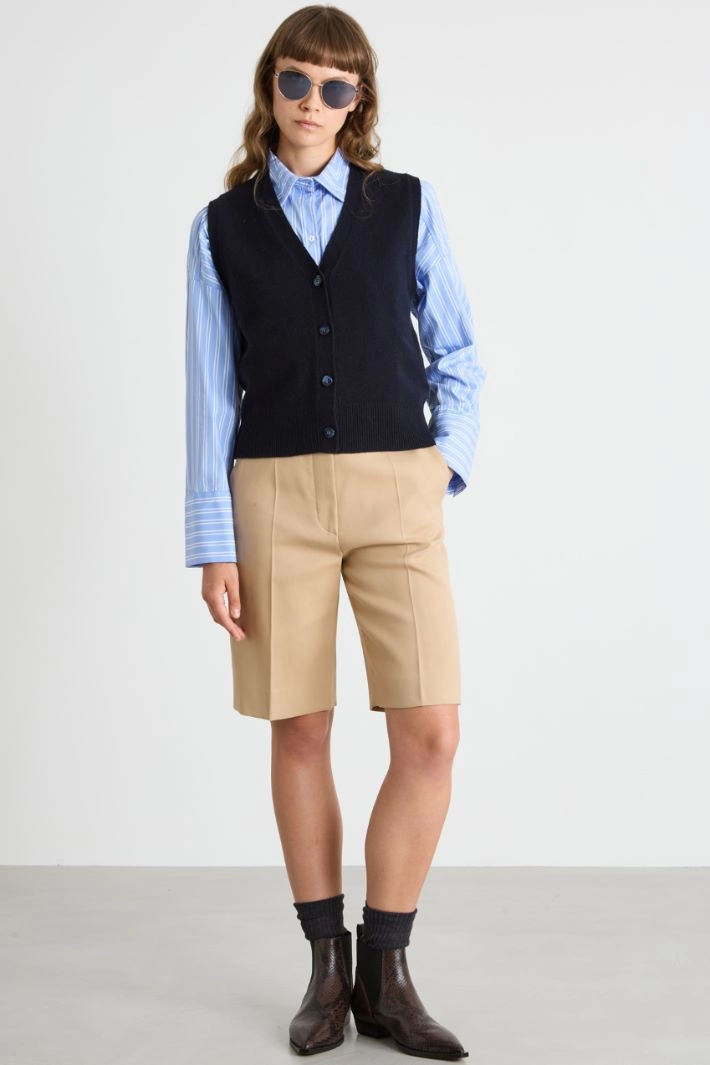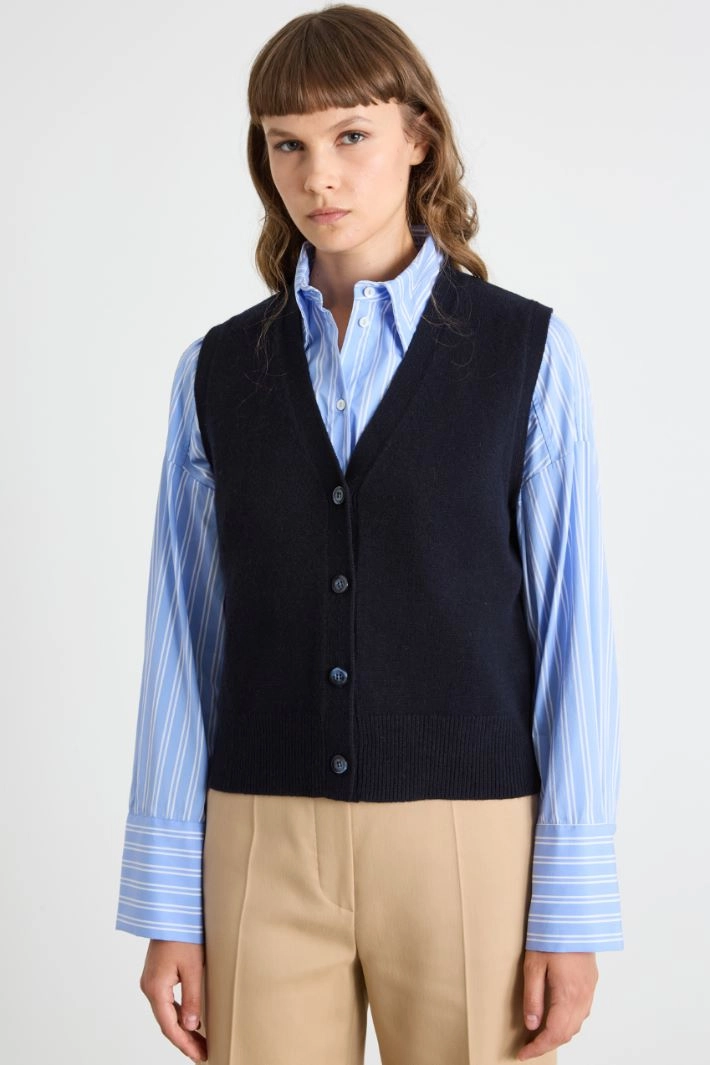 Straight-fit gilet in wool and cashmere yarn, with a V-neck, ribbed edges and button fastening.