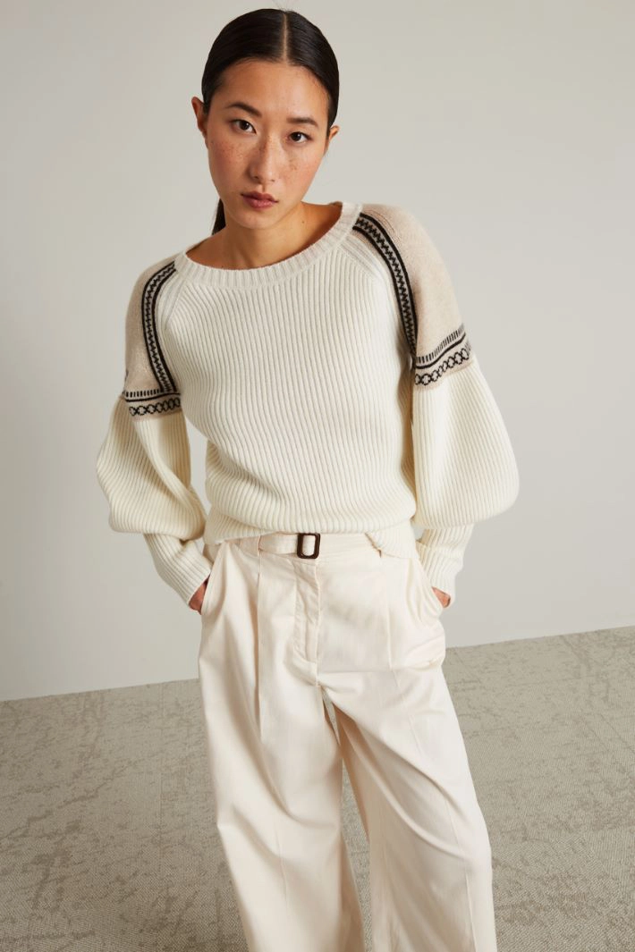 Regular-fit sweater in ribbed wool and cashmere yarn, with inlay motif on the shoulders, boat neckline and long balloon sleeves.