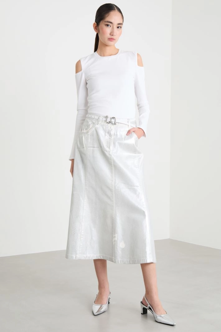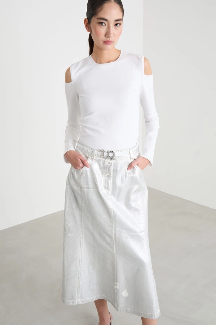 Slim-fit jumper crafted in crepe viscose yarn worked in a fine stockinette stitch, with a round neckline, long sleeves and a square cut-out detail at the shoulders. Ribbed trims.