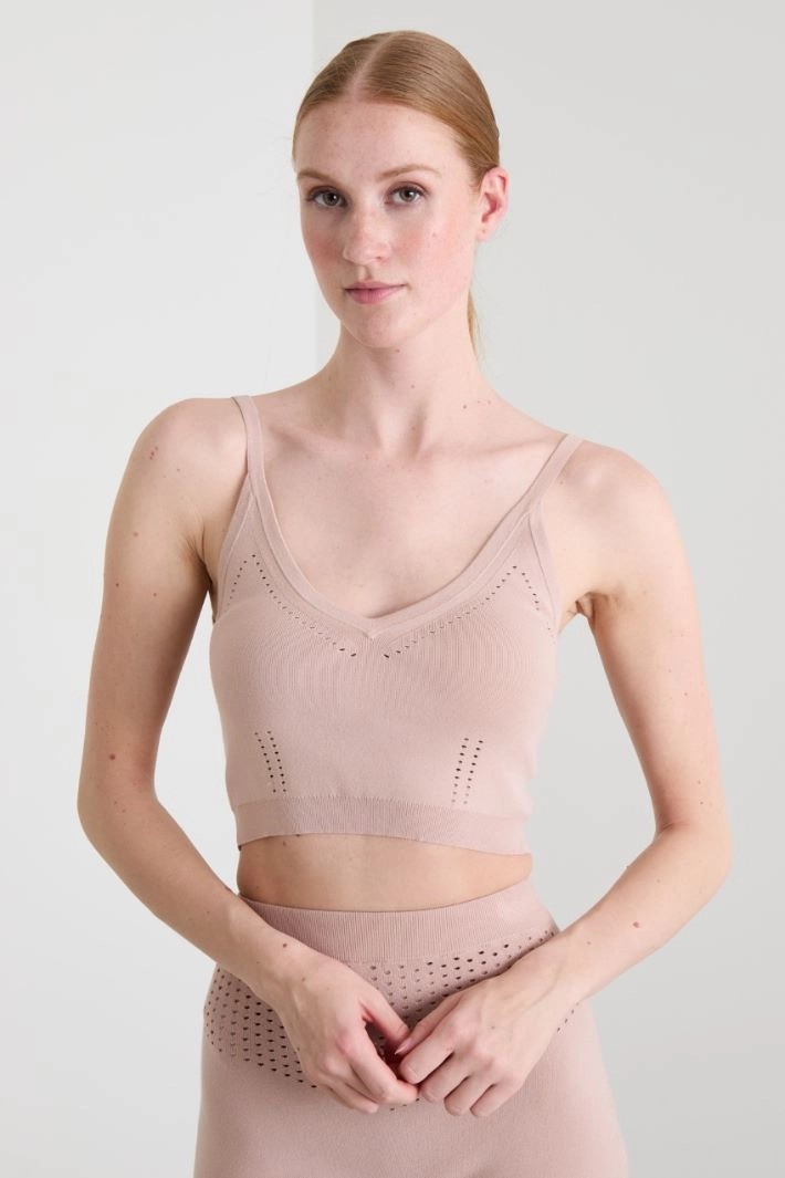 Cropped top with a fitted cut in viscose blend knit, with openwork design, V-neck, thin shoulder straps and ribbed trims.