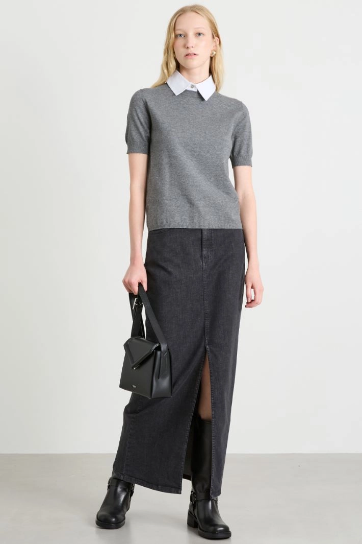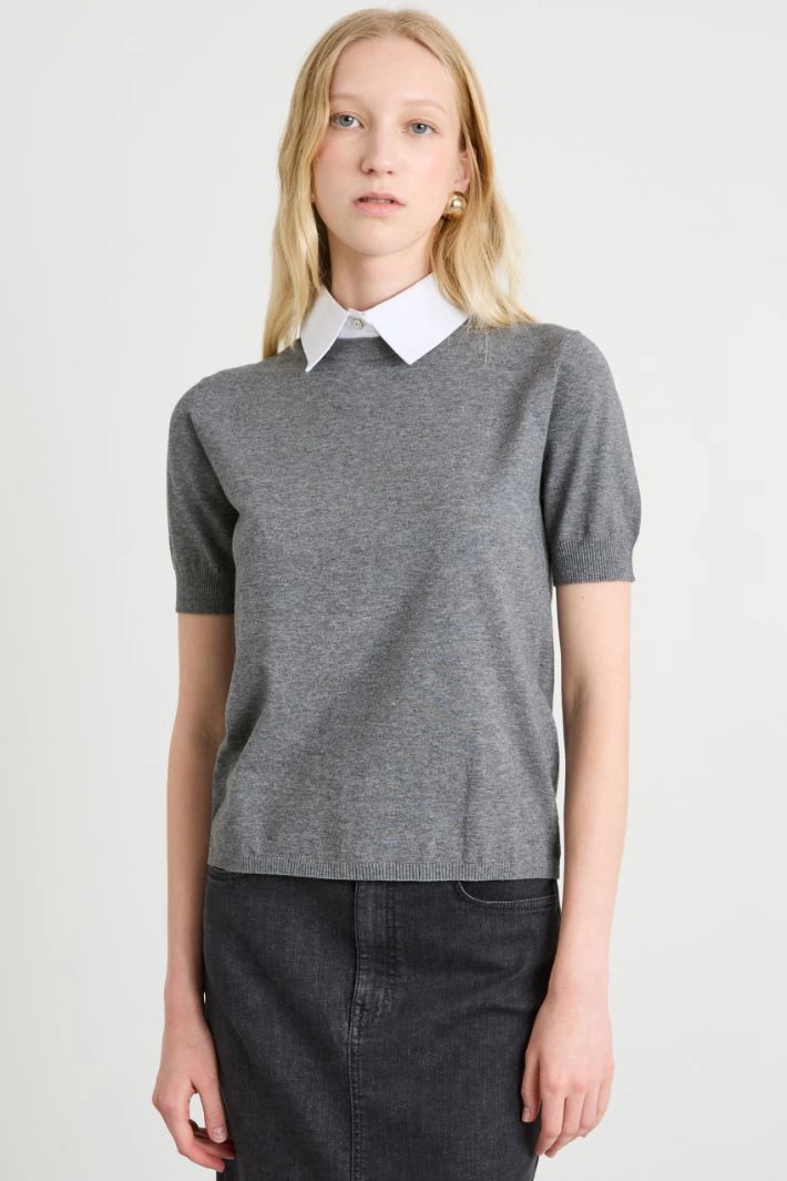 Semi-fitted sweater in viscose blend yarn with removable shirt collar, crew neck and short sleeves.