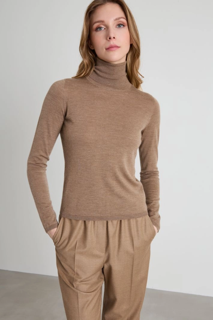 Semi-fitted turtleneck in pure cashmere yarn, with a high neck and long sleeves.