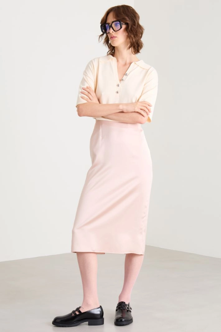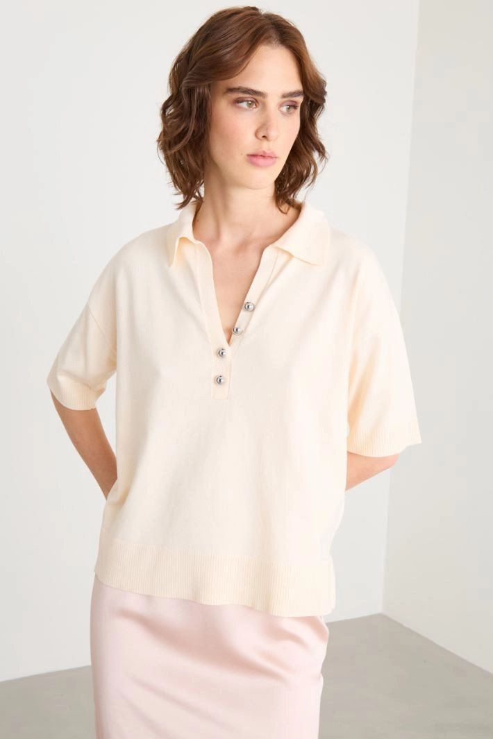 Regular-fit sweater in viscose blend yarn, with a shirt collar and V-neck embellished with buttons, short sleeves and ribbed edges.