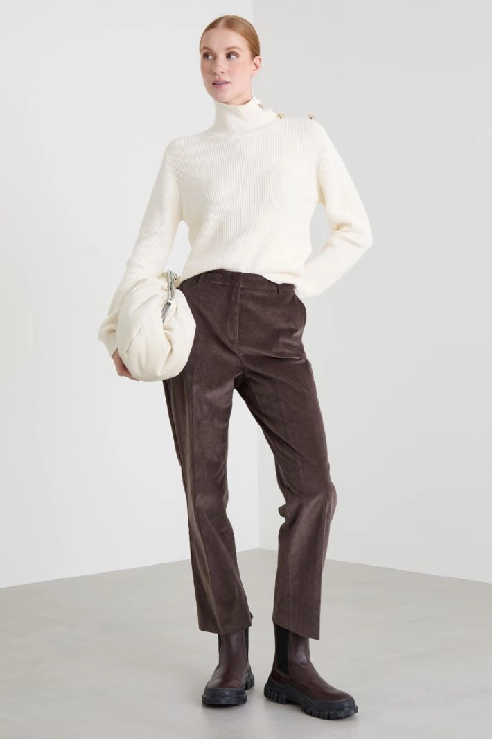 Regular-fit sweater in viscose blend yarn, with high neck, long sleeves with metal button detail on the shoulder.