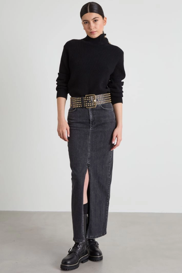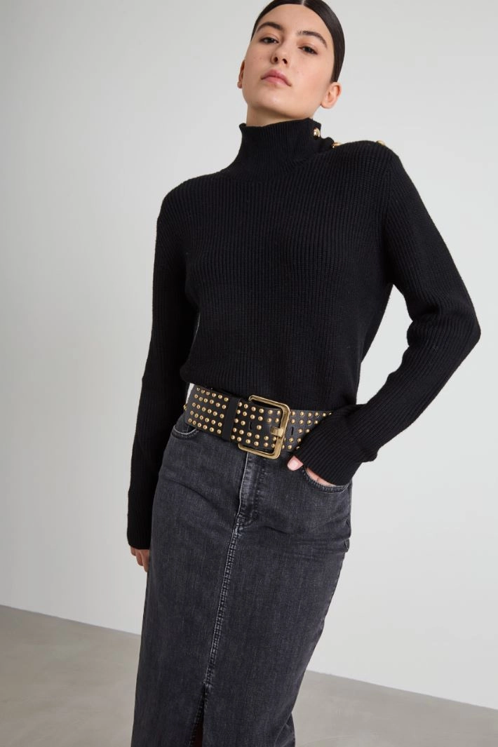 Regular-fit sweater in viscose blend yarn, with high neck, long sleeves with metal button detail on the shoulder.