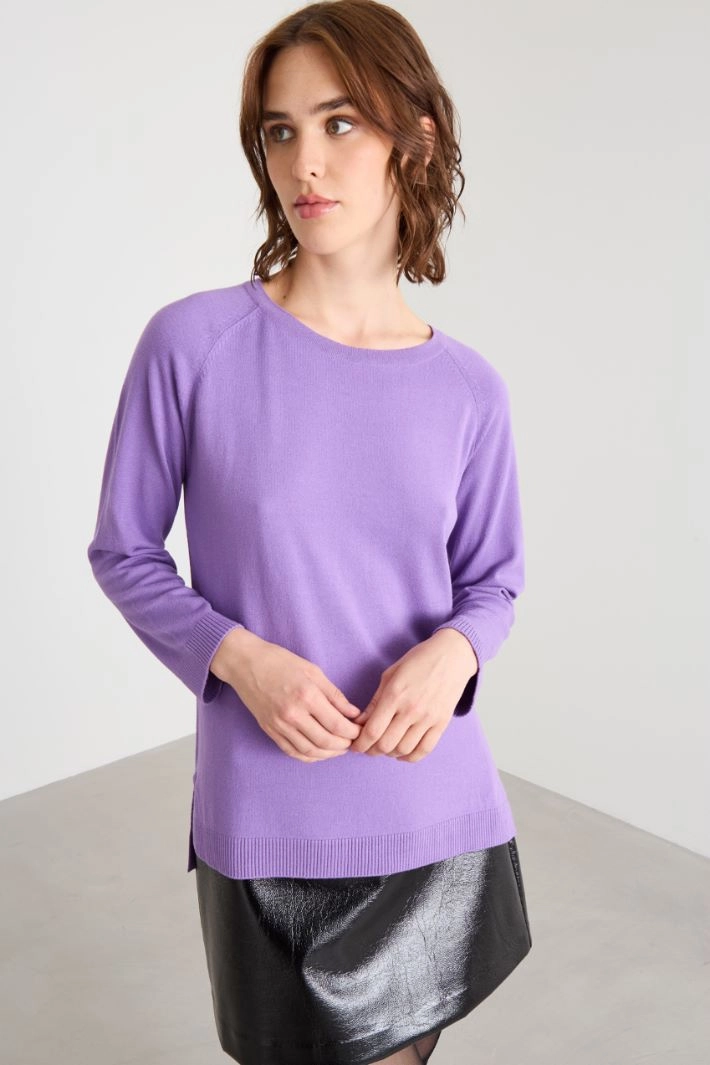 Straight-cut sweater in viscose blend yarn, featuring a crew neck, long raglan sleeves and an asymmetrical hem with side slits.