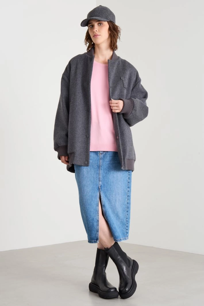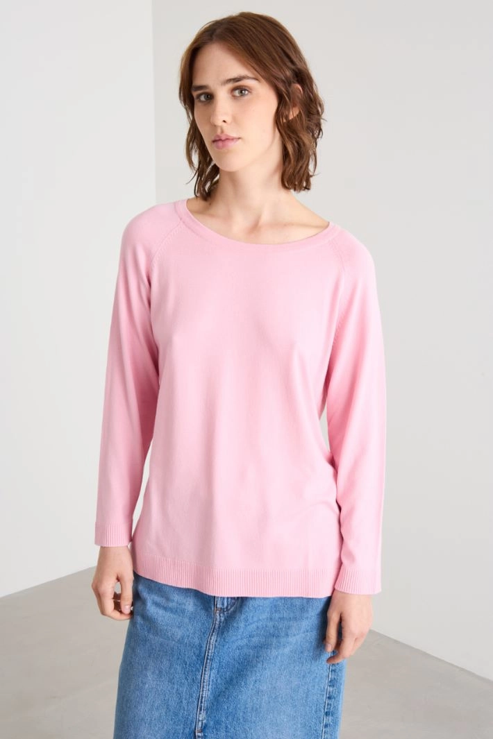 Straight-cut sweater in viscose blend yarn, featuring a crew neck, long raglan sleeves and an asymmetrical hem with side slits.
