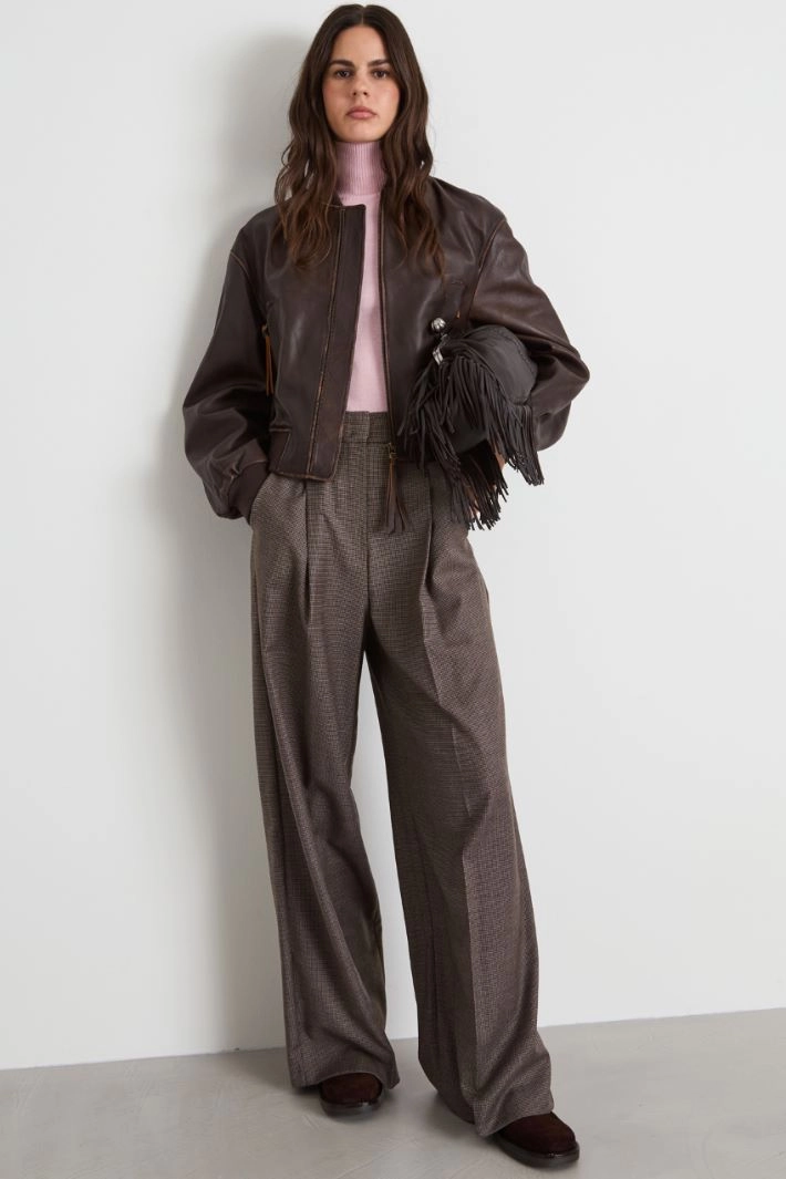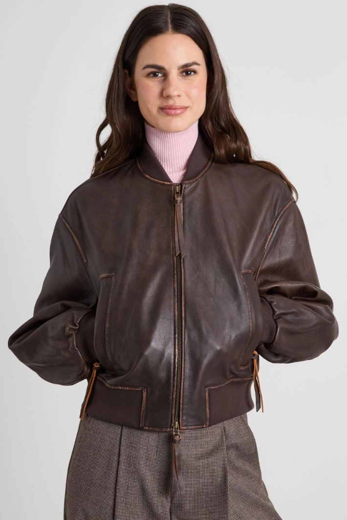 Straight-fit bomber jacket in genuine nappa leather with an aged finish, ribbed knit inserts, stand-up collar, long sleeves, side welt pockets with zip and double-slider zip fastening. Lined.