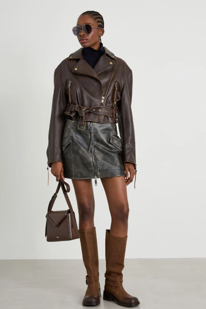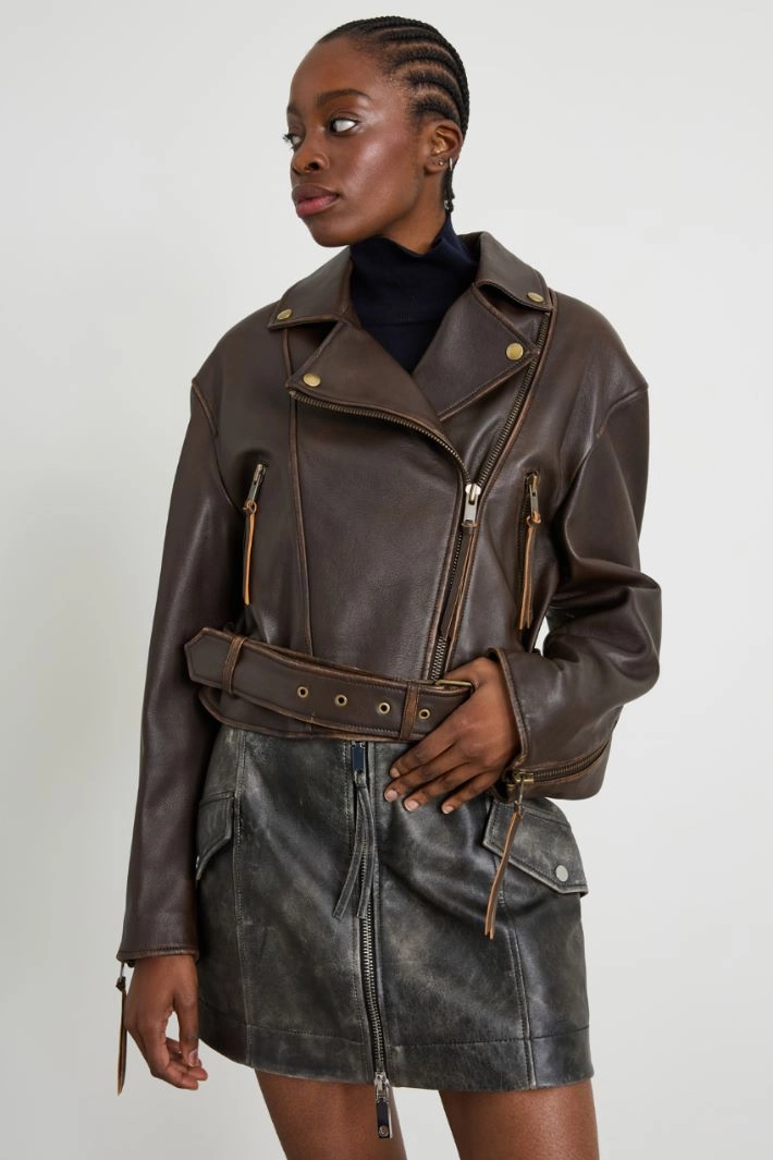 Straight-fit jacket in genuine leather, with studded lapel collar, long sleeves, side zip pockets and adjustable strap at the bottom. Asymmetrical zip fastening. Lined.