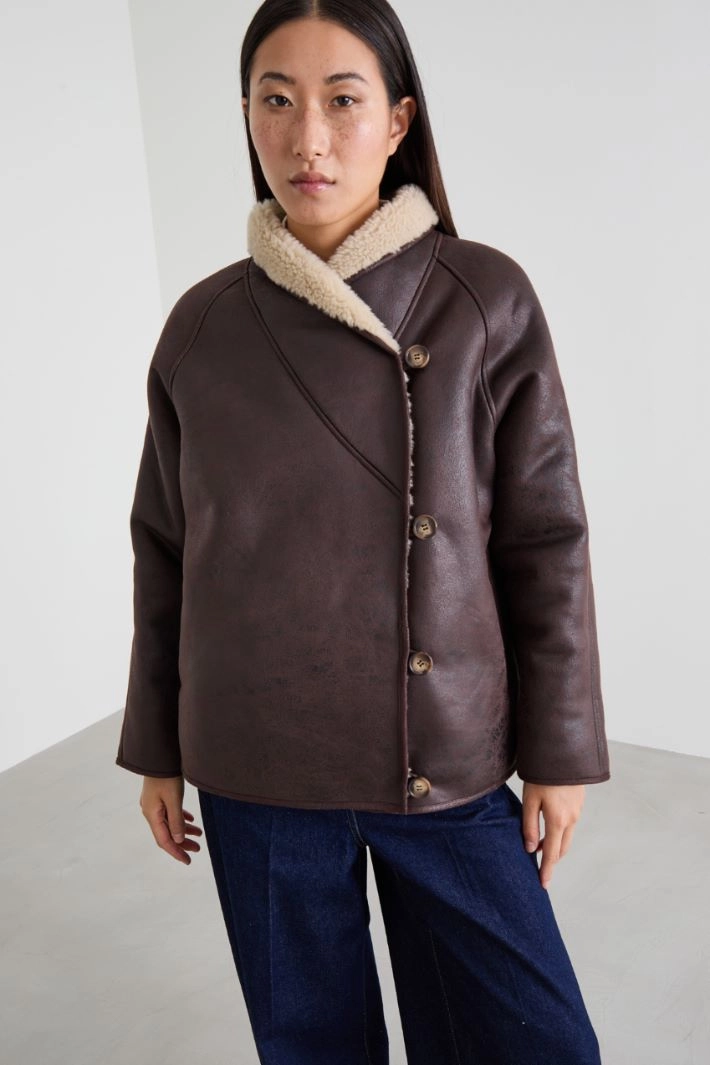 Loose-fit jacket in aged faux sheepskin, with shawl collar, long raglan sleeves, double-welt side pockets and asymmetrical button fastening. Plush interior.