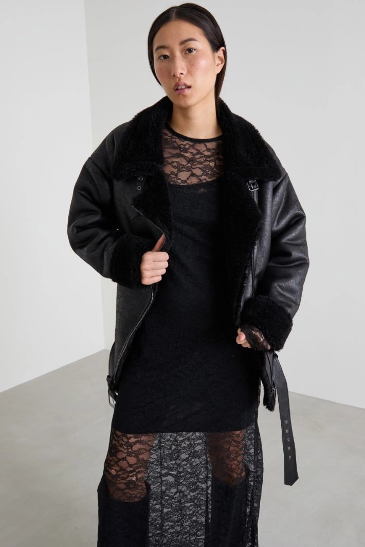 Loose-fit biker jacket in aged faux sheepskin-look fabric, with a shirt collar finished with a strap, long dropped sleeves and side zip pockets. Adjustable belt at the bottom and asymmetrical zip fastening. Plush-effect interior.