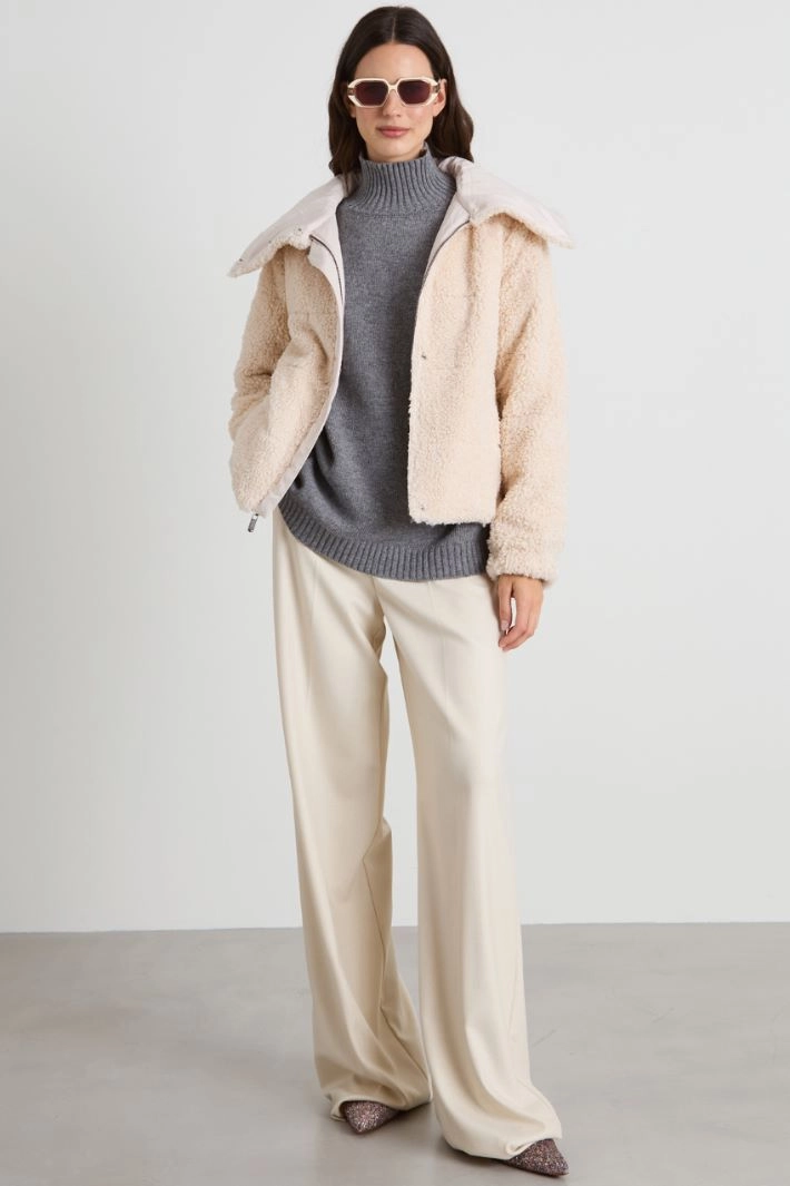 Straight padded jacket in quilted plush effect fabric, with a high neck, long sleeves, side kangaroo pockets and hidden fastening with zip and snap buttons. Reversible.