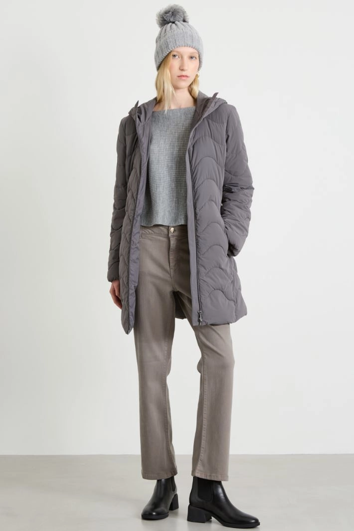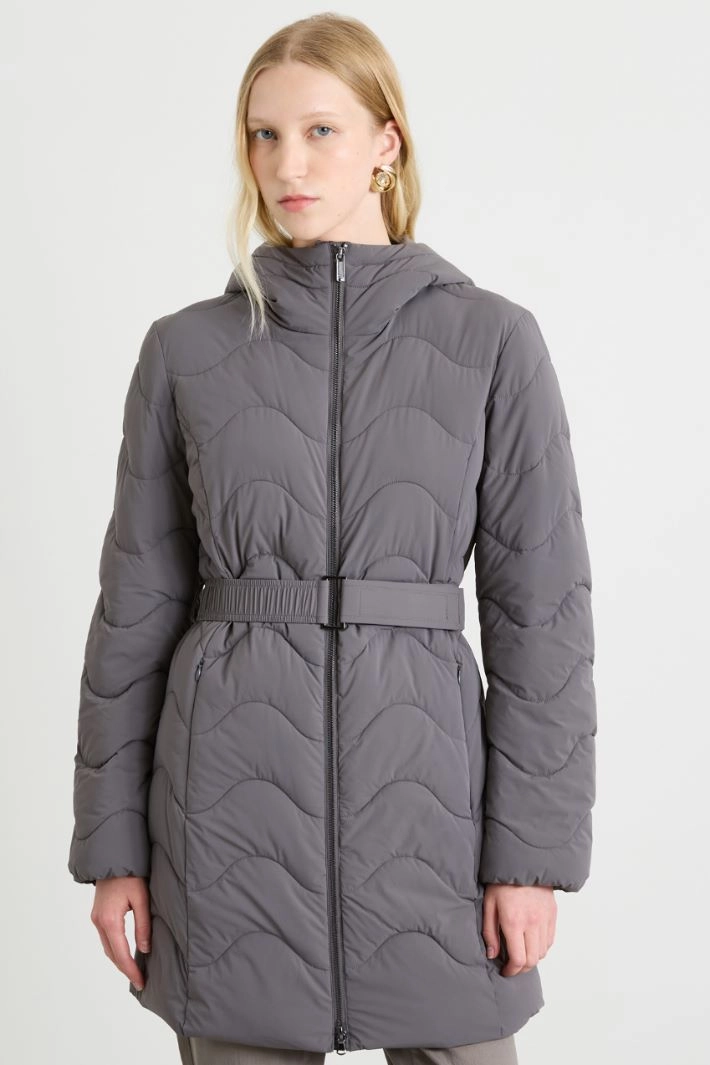 Padded slim fit jacket in water-repellent technical fabric, hooded collar, long sleeves, pockets with invisible zip and stitched motif. Central zip fastening and elastic belt with Velcro fastening.