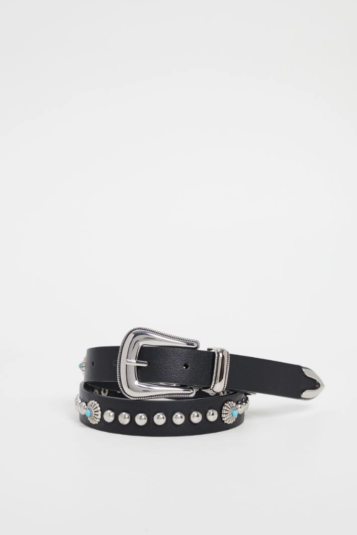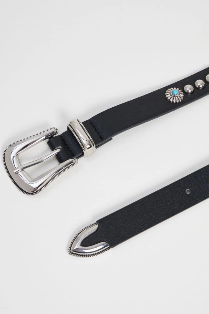 Faux leather, with stud motif, tip and loop with knurled details, rounded buckle and metal pin.