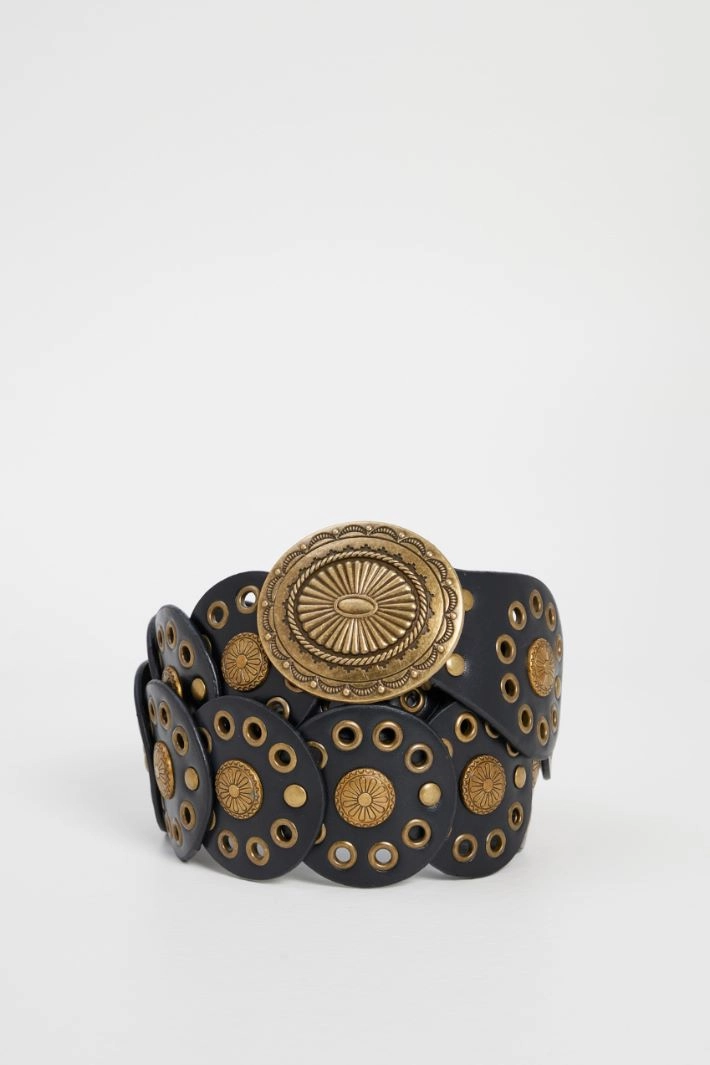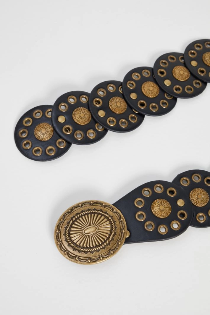 Belt in faux leather circles with metal details and fastening with an interlocking buckle.
