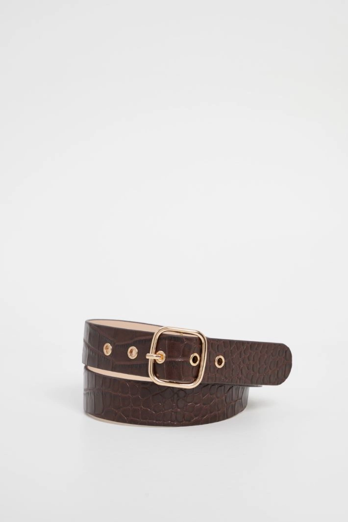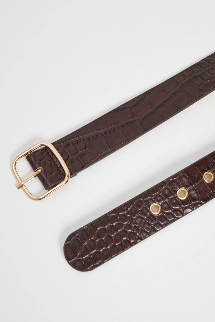Belt in crocodile-print faux leather, with square buckle and metal pin.