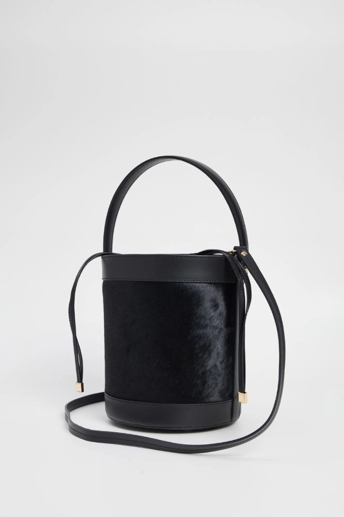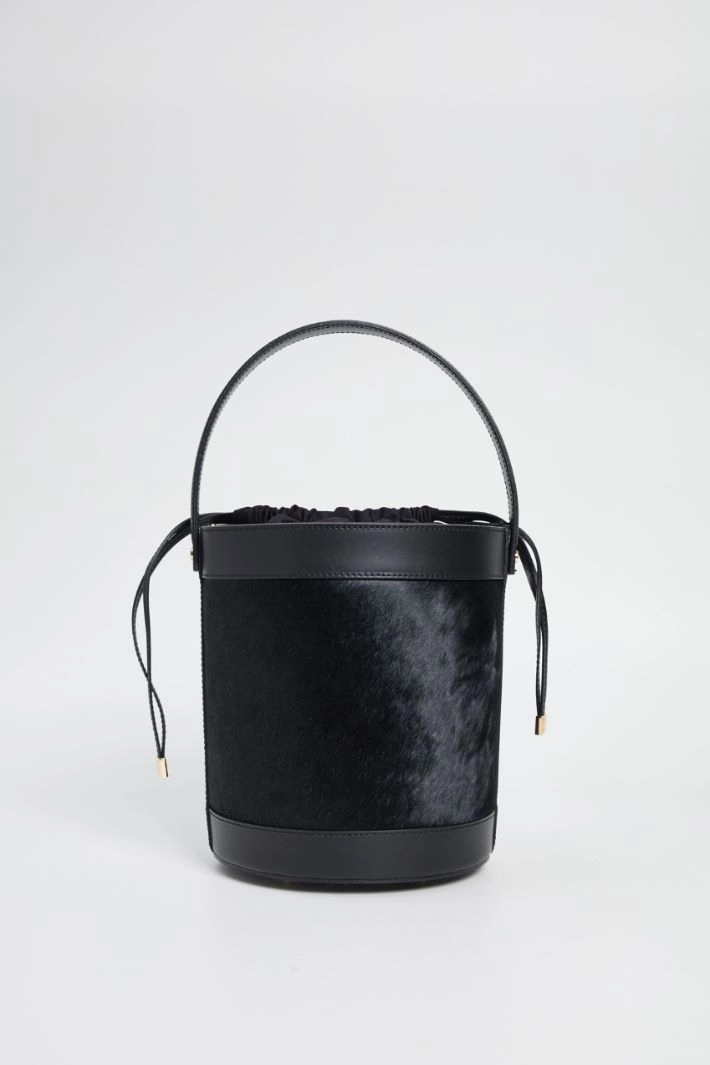 Bucket bag in pony skin, with single handle, removable shoulder strap and drawstring closure.