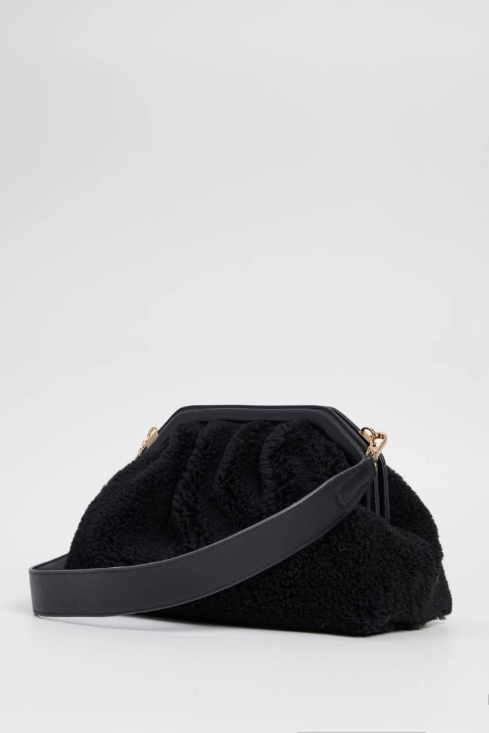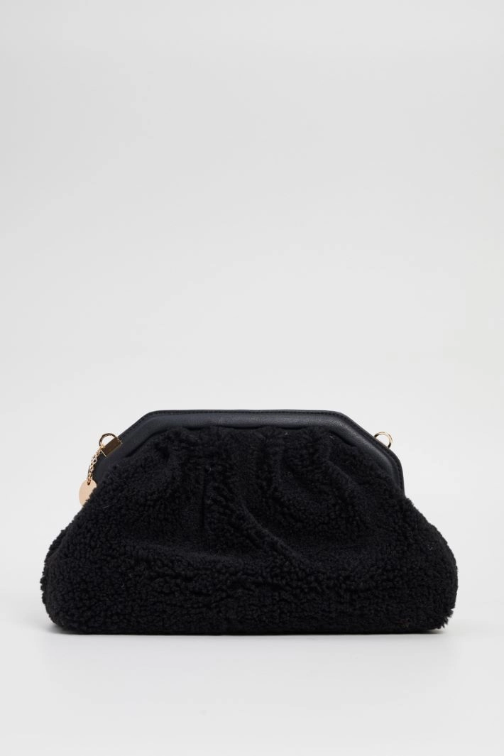 Clutch in faux leather with plush insert, internal pockets and removable shoulder strap.