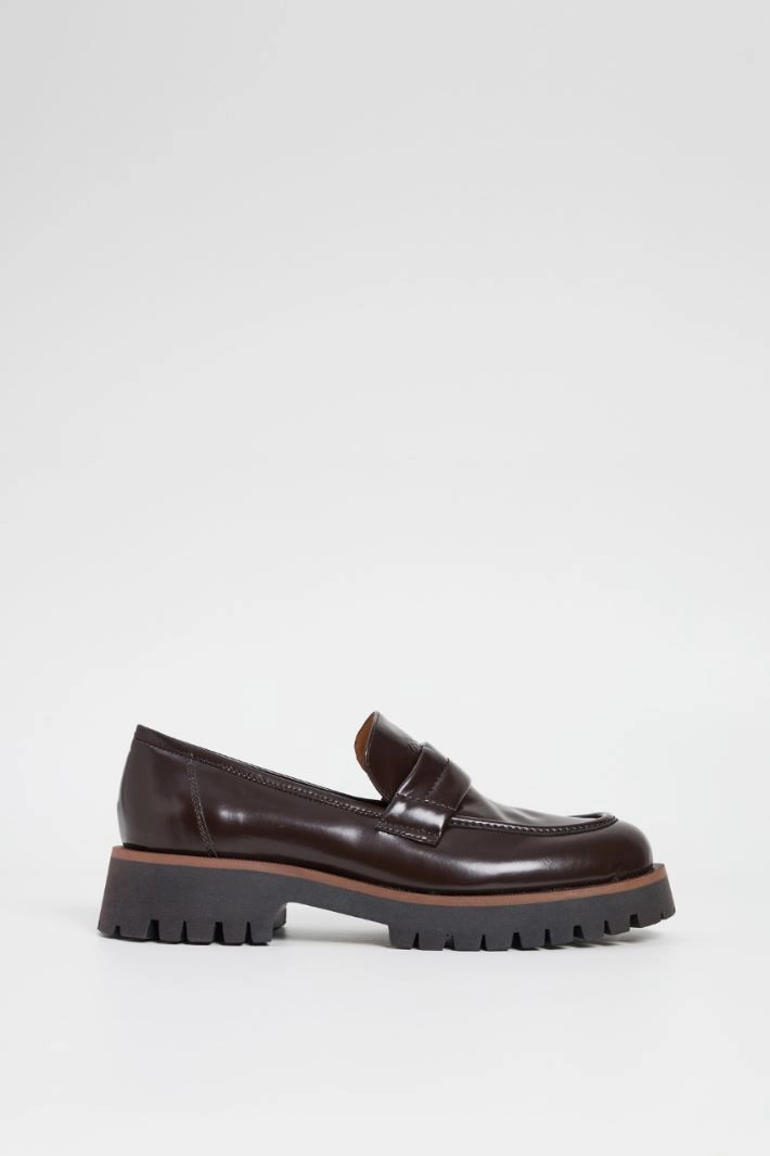 Moccasin in genuine shiny leather with stitching on the upper. Rubber trekking sole.