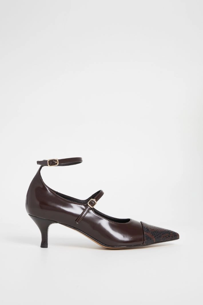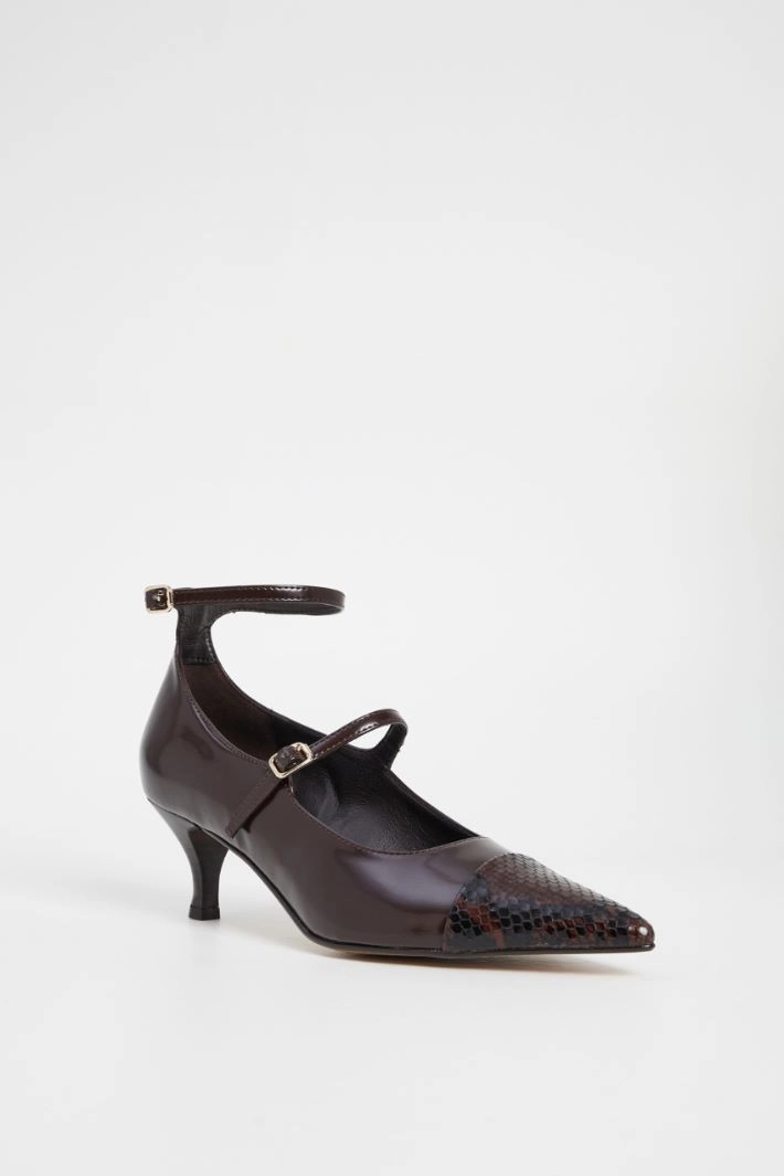 Pumps in genuine leather with a pointed toe with a crocodile effect and a spool heel. Closure with buckle straps. Rubber sole.