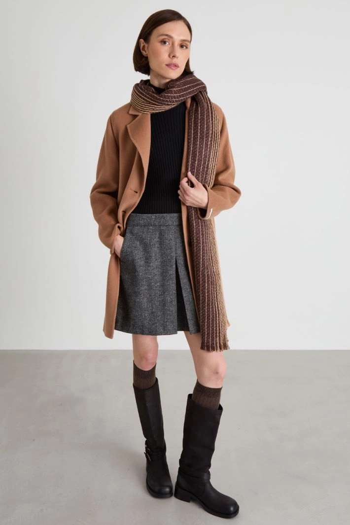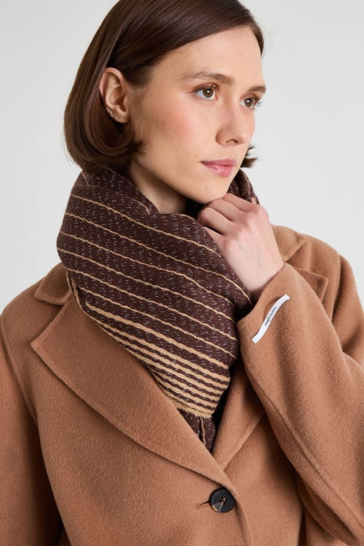 Stole in yarn-dyed fabric, with lamé fibre insert and fringed edges.