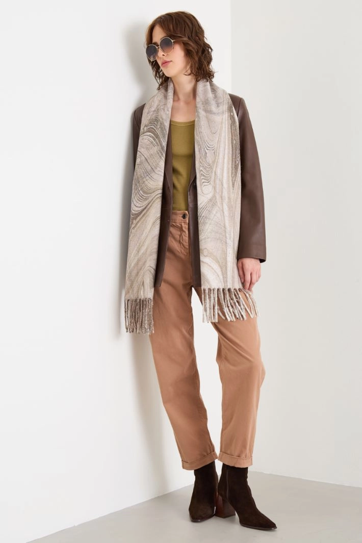 Scarf in patterned yarn, with lamé fibre insert and fringes at the bottom.