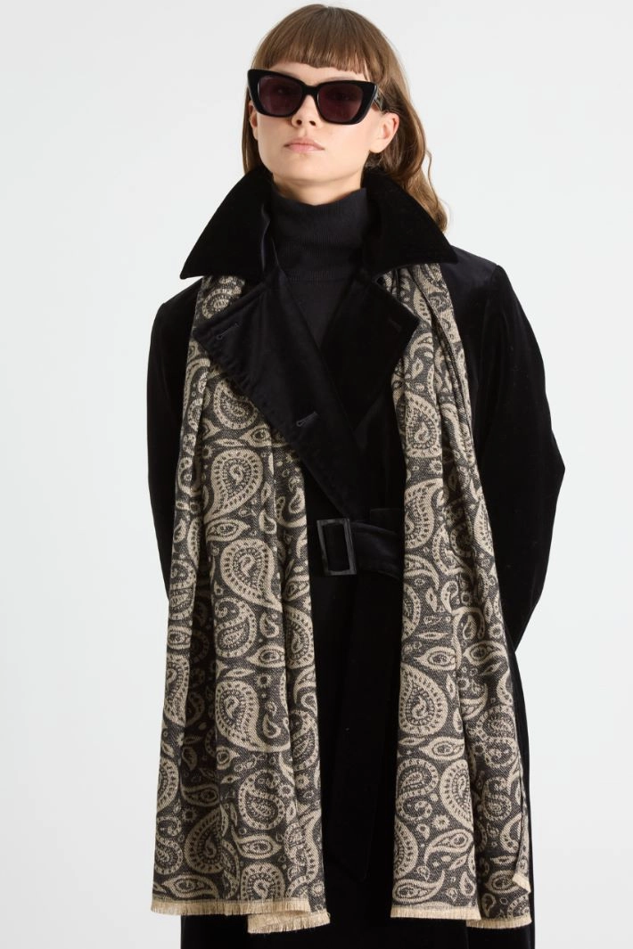 Stole in jacquard fabric, with lamé fibre insert and fringed edges.