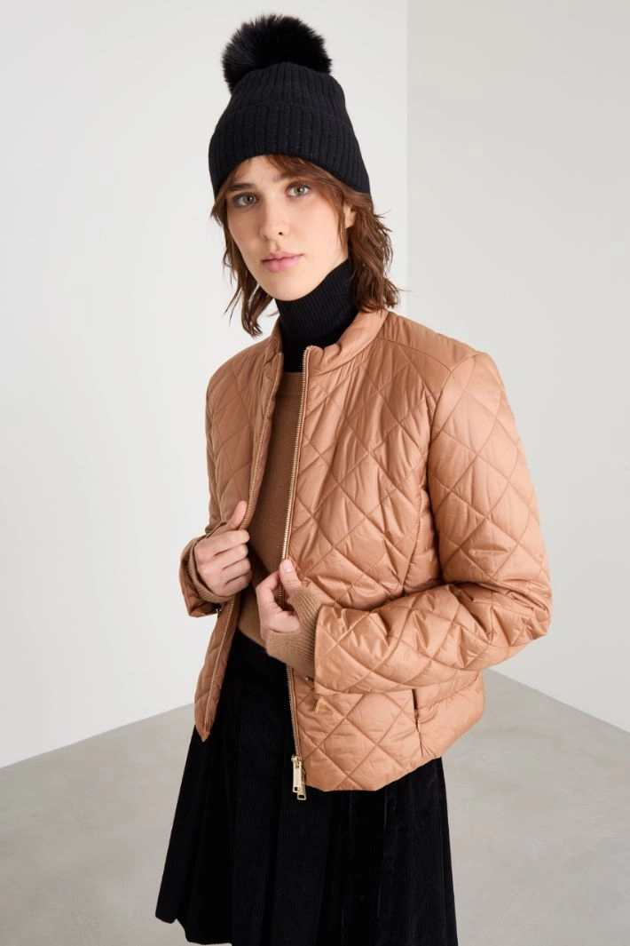 Hat in ribbed wool and viscose blend yarn, with lamé inserts, turn-up and pom pom.