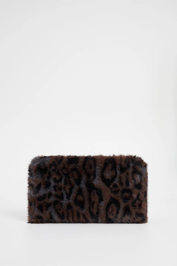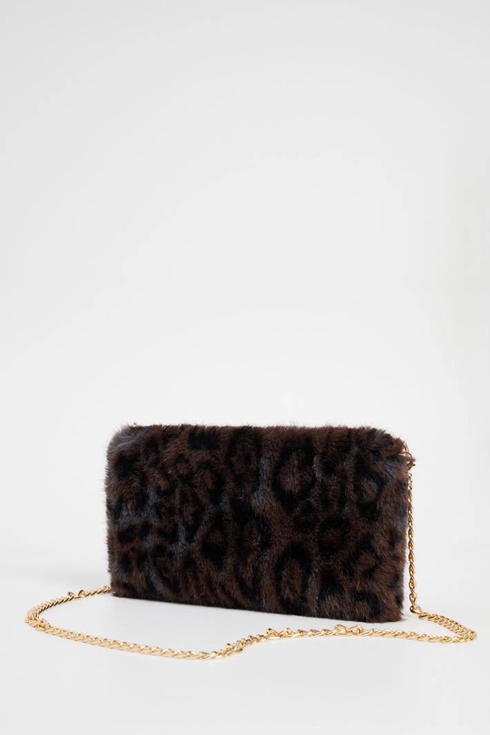 Bag in printed plush-effect fabric, with removable chain shoulder strap, lined interior and zip closure.