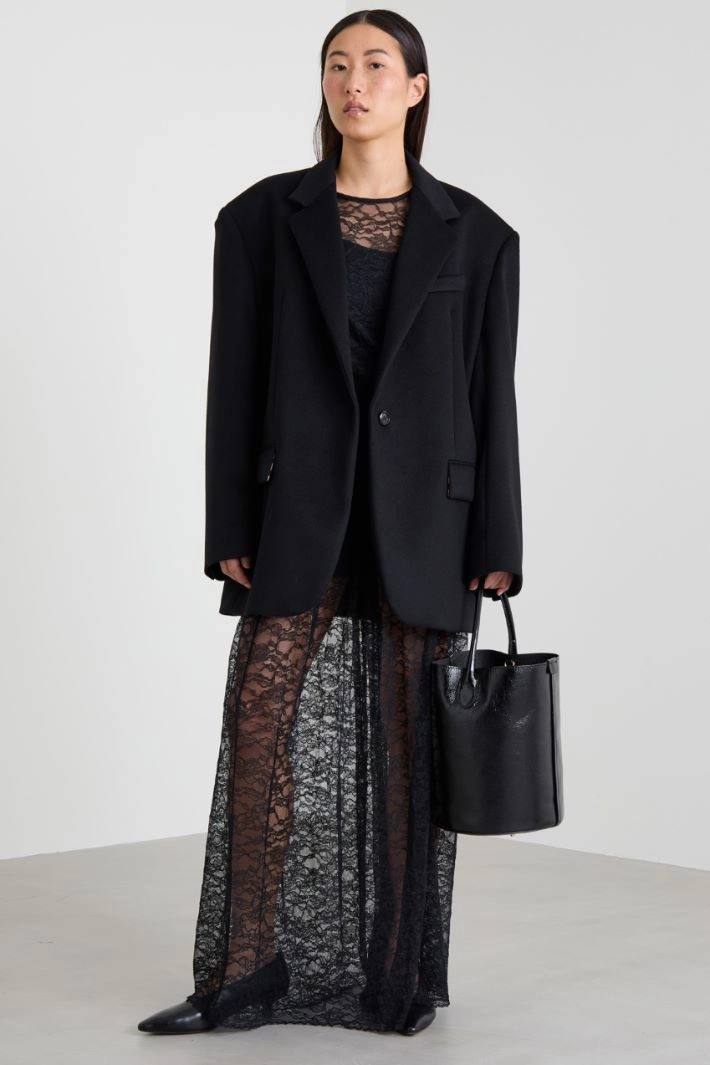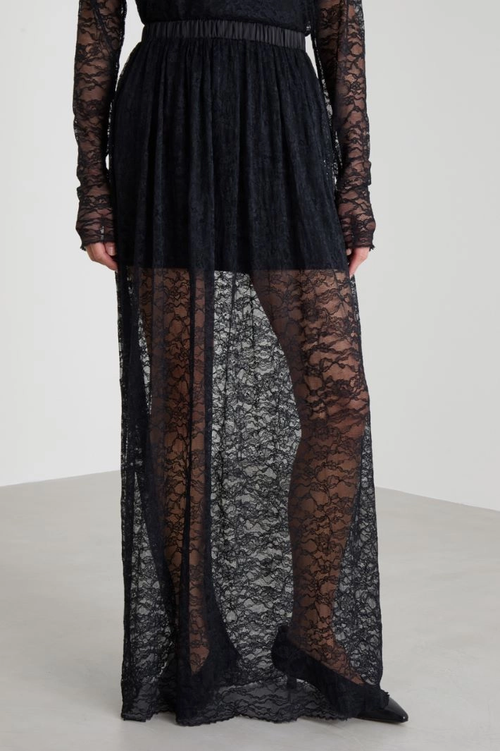 Long loose lace skirt with an elastic insert at the waist. Partially-lined.