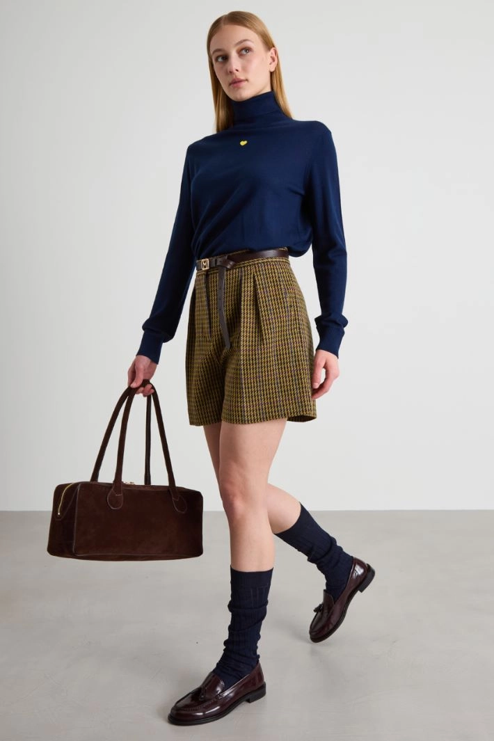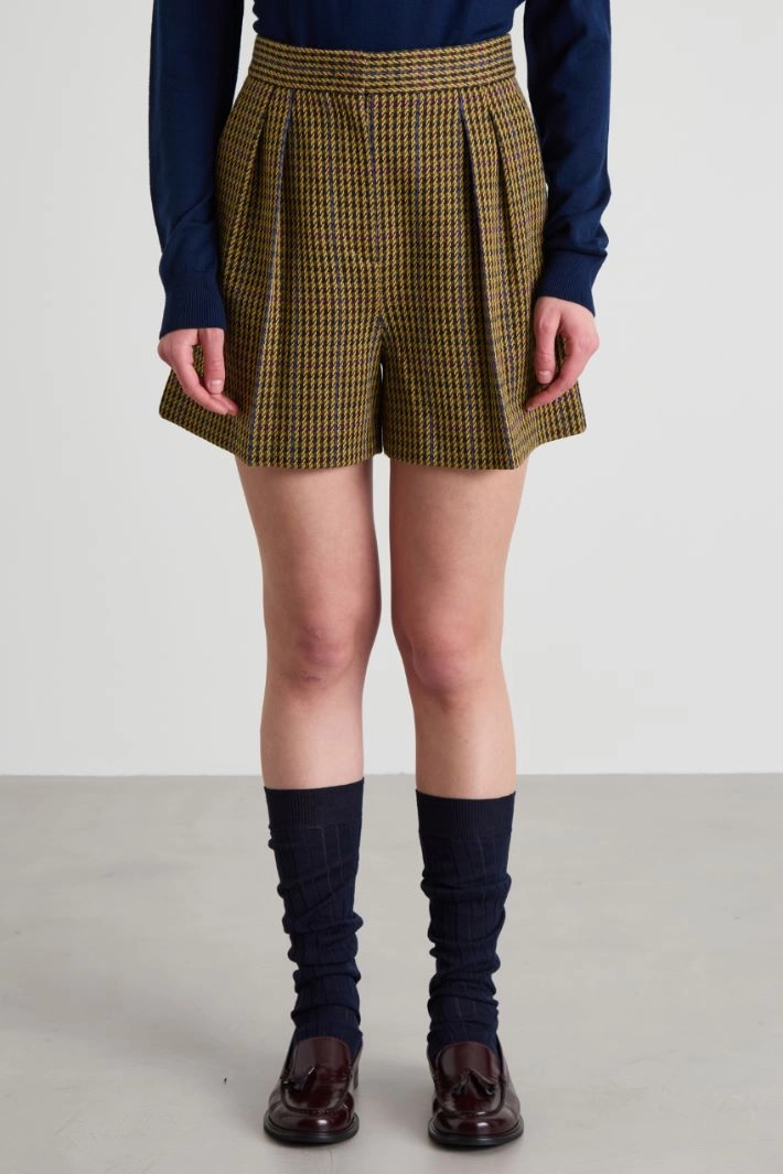 Shorts evasé realizados en punto jacquard pata de gallo de lana y algodón, con doble pliegue en la cintura, bolsillos franceses laterales y cierre oculto con cremallera, botón y ganchos.