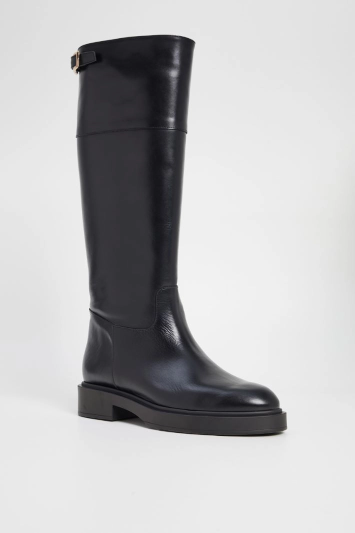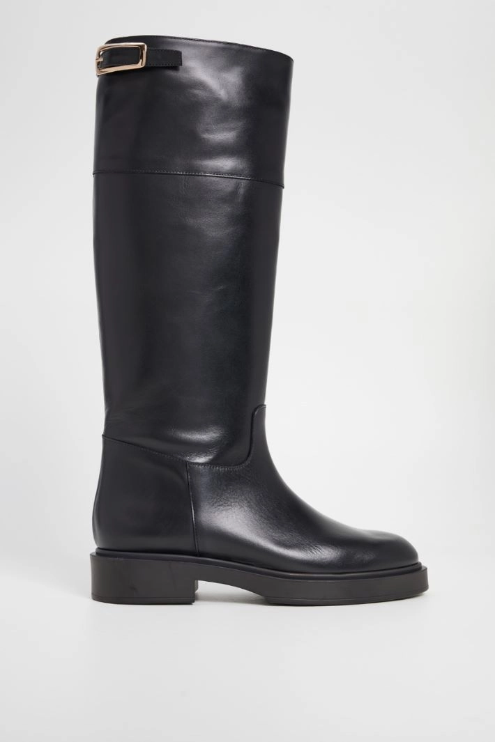 Boots in genuine leather, with buckle detail on the calf and rounded toe.