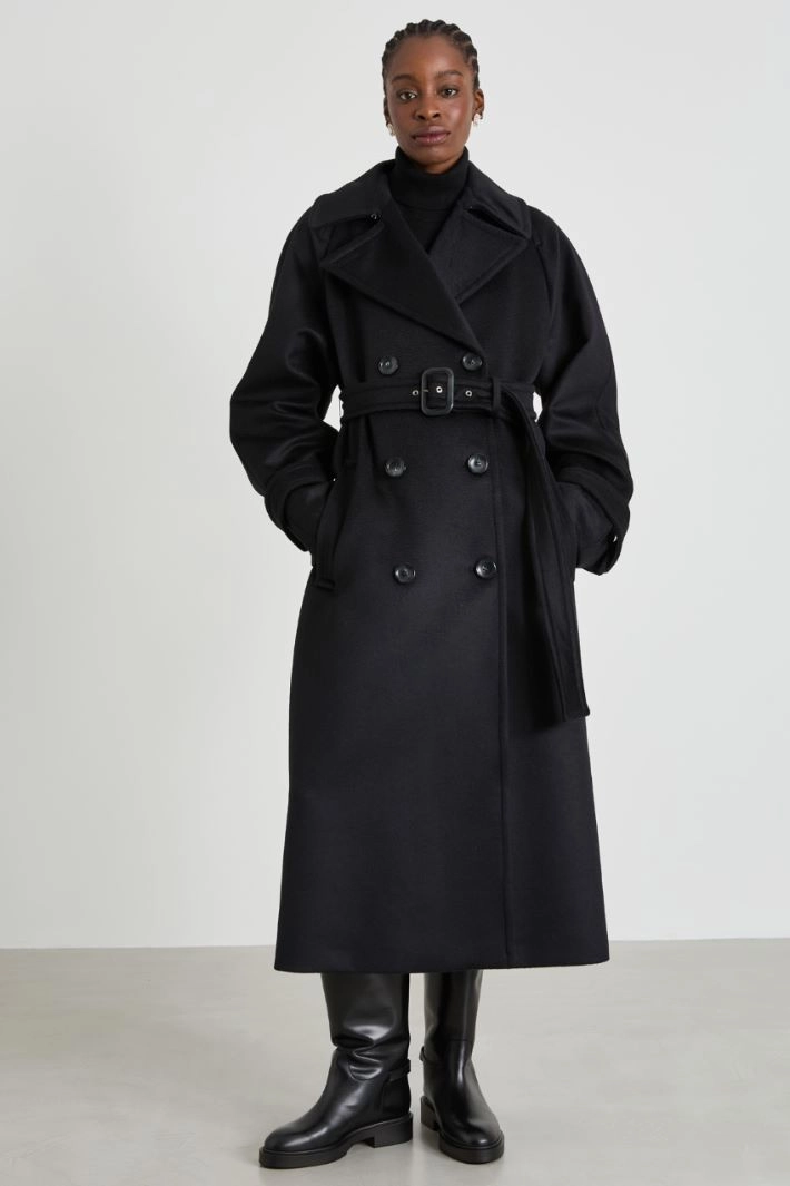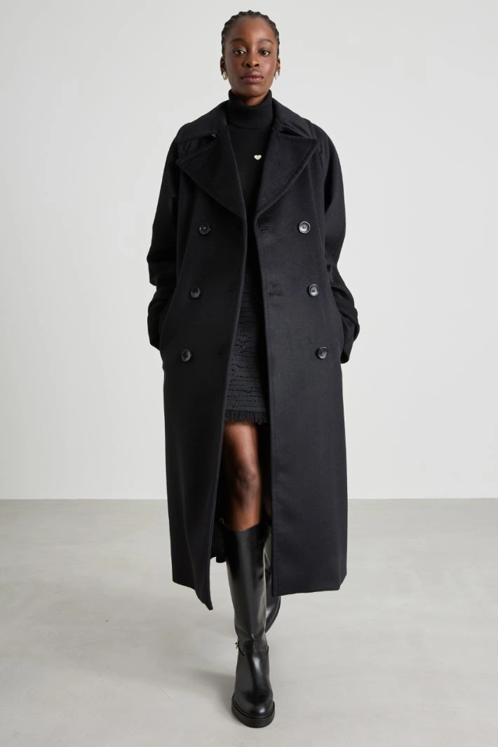 Straight-fit coat in pure wool sable drap, with lapel collar, long sleeves with straps, welt pockets, counter pleat motif on the back and matching belt. Double-breasted fastening with buttons. Lined.