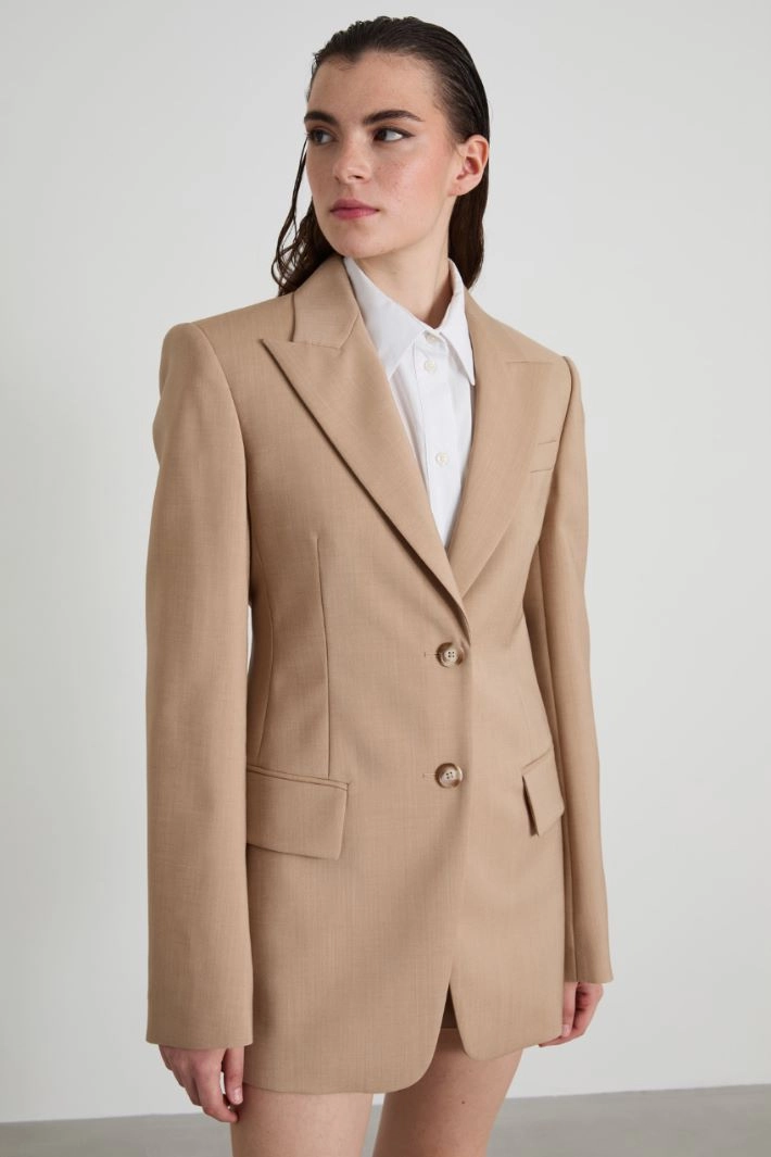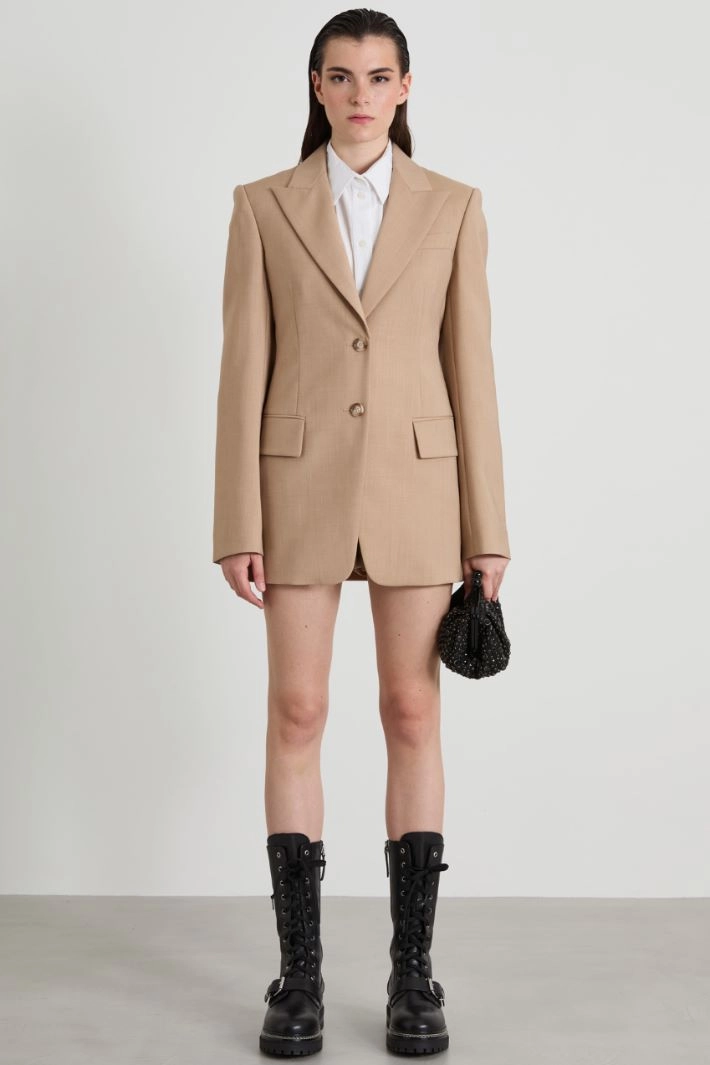 Fitted blazer in wool and mohair blend canvas, with peak lapel, long sleeves with buttons, welt pocket on the chest and flap pocket on the sides, and vent on the center back. Button fastening. Lined.