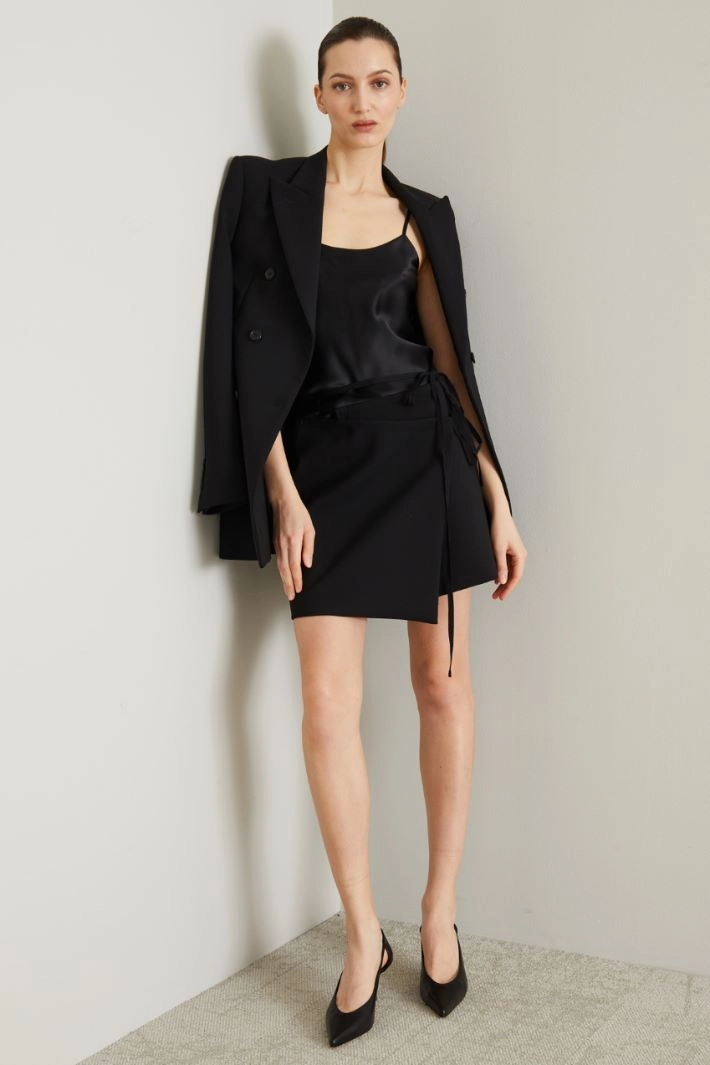 Short wrap skirt in wool canvas. Fastening with braided laces at the waist.