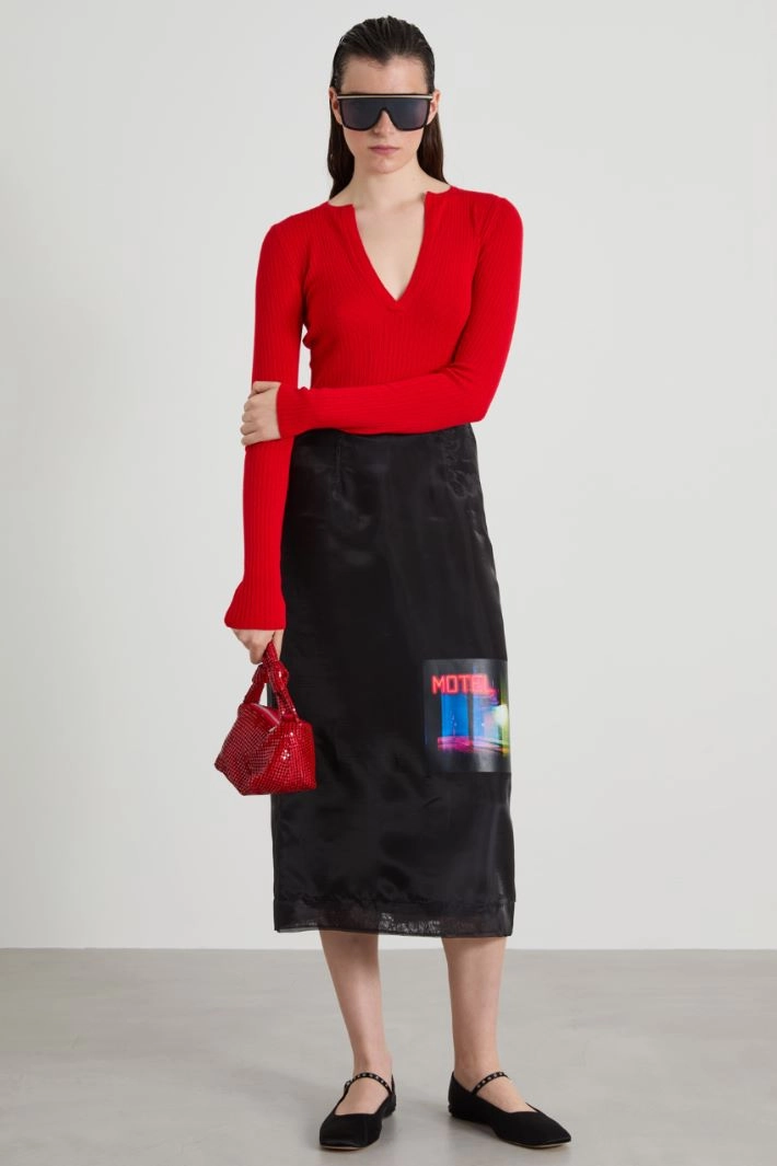 Straight-fit organza midi skirt with appliqué on the front and invisible zip fastening on the back. Matching underskirt.