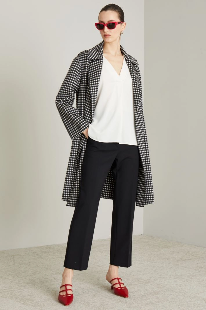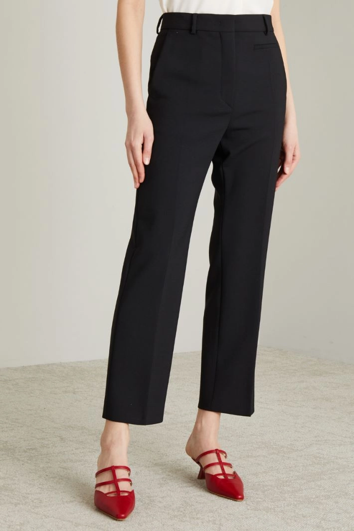 Straight-fit trousers in double pure wool stretch canvas with belt loops at the waist, pressed pleats on the leg, French side pocket, front pocket and back welt pocket. Fastening with hidden zip, button and hook