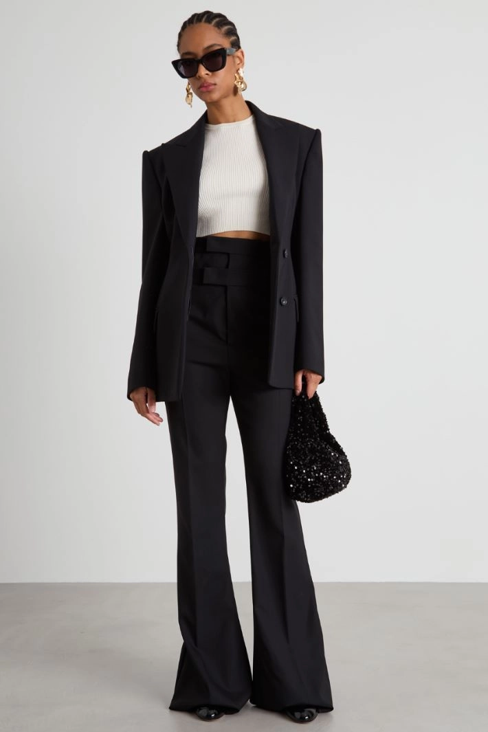 Flare trousers in pure wool canvas, with double waist fastening, belt loops, French pockets in front, welt pockets in back and crease ironed lengthwise. Hidden fastening with zip, button and hooks.