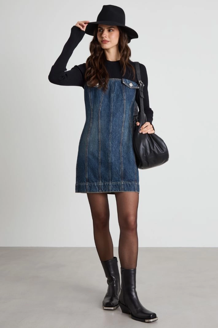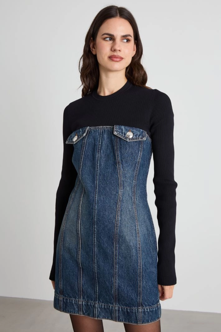 Short, fitted dress in pure cotton denim, with a ribbed knit insert on the upper part, crew neck, long sleeves, button placket on the chest and zip fastening on the back.