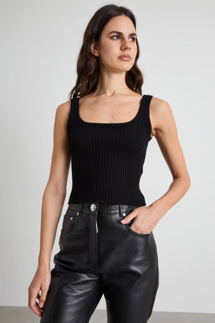 Cropped, fitted tank top in ribbed viscose blend knit, with a U-neck and shoulder straps.
