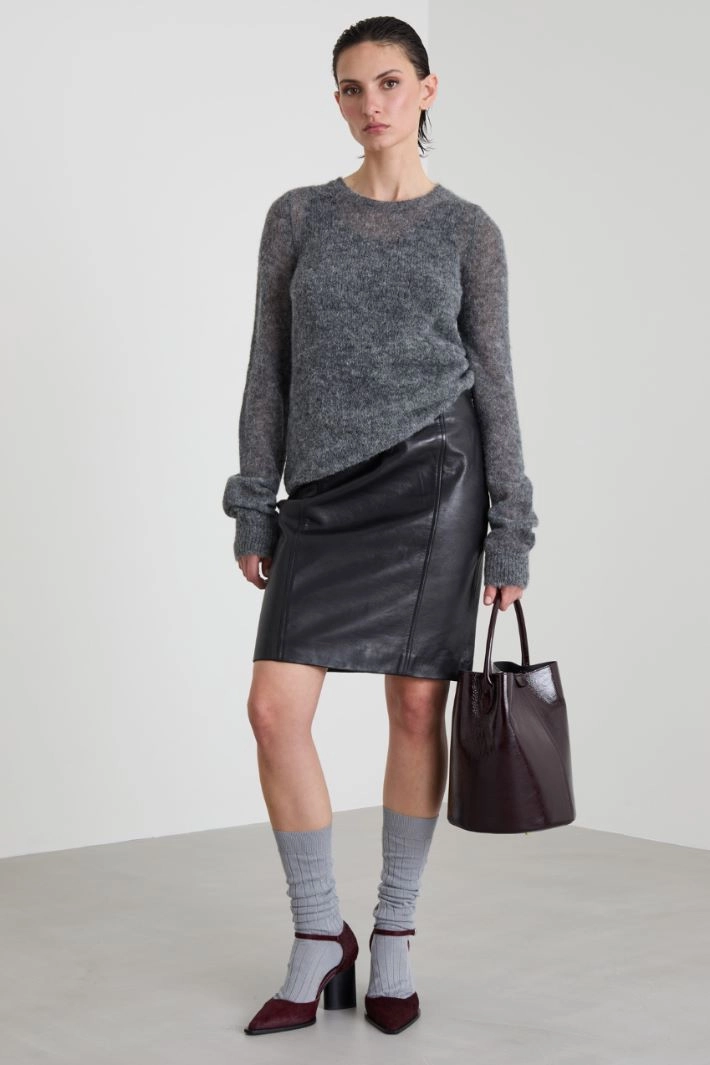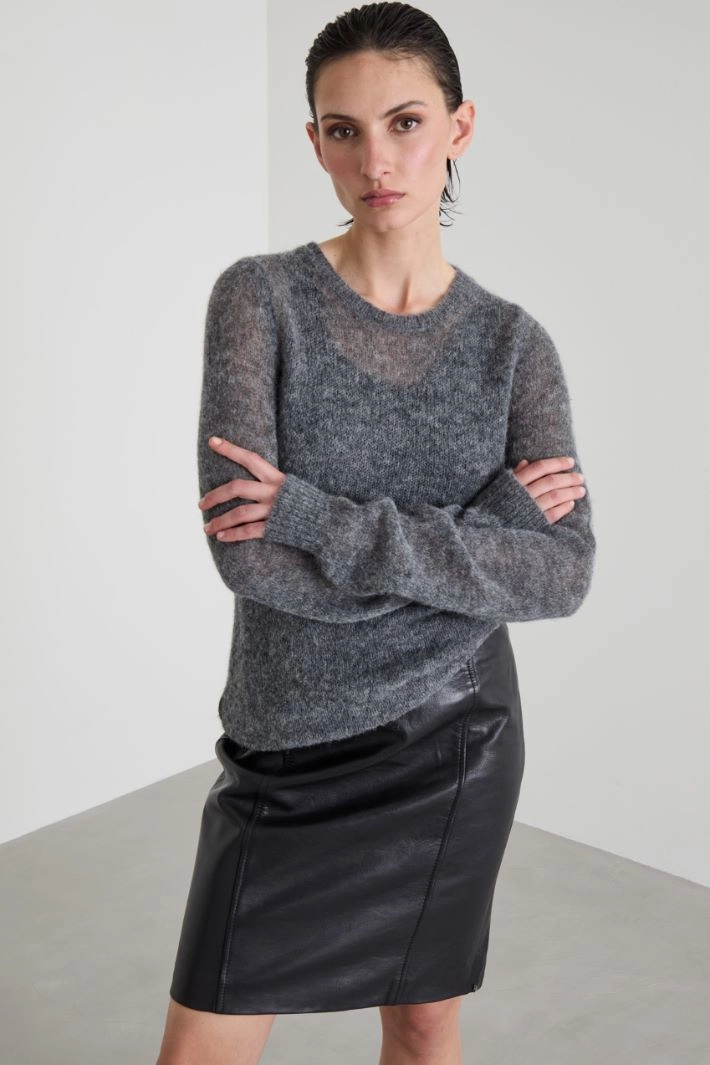 Fitted sweater in alpaca and wool yarn with openwork design, round neckline and long sleeves.