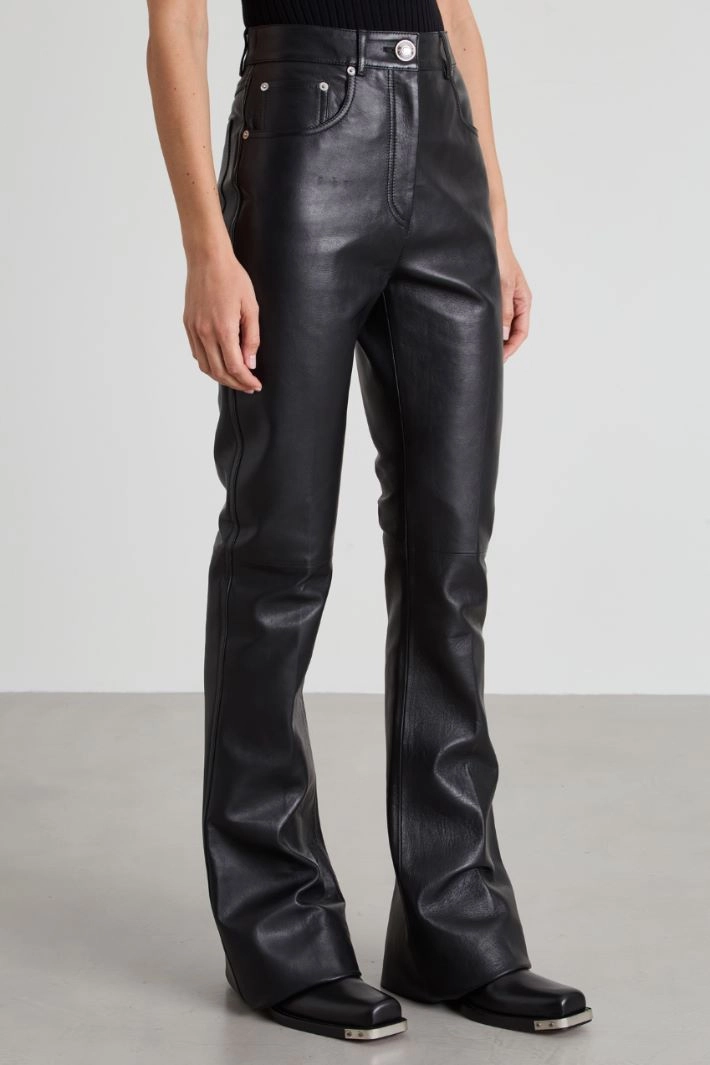 Flare trousers in genuine nappa leather, with belt loops, five pockets, pressed crease and fastening with a hidden zip and button.