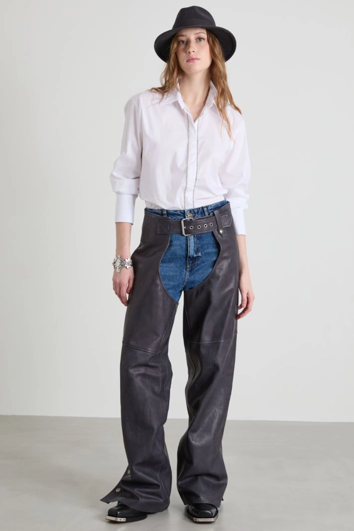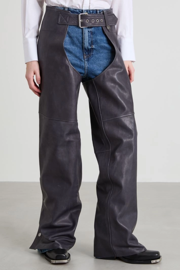 Chaps trousers in genuine nappa leather, with elastic waistband insert on the back, press studs and zip on the sides. Adjustable buckle fastening.